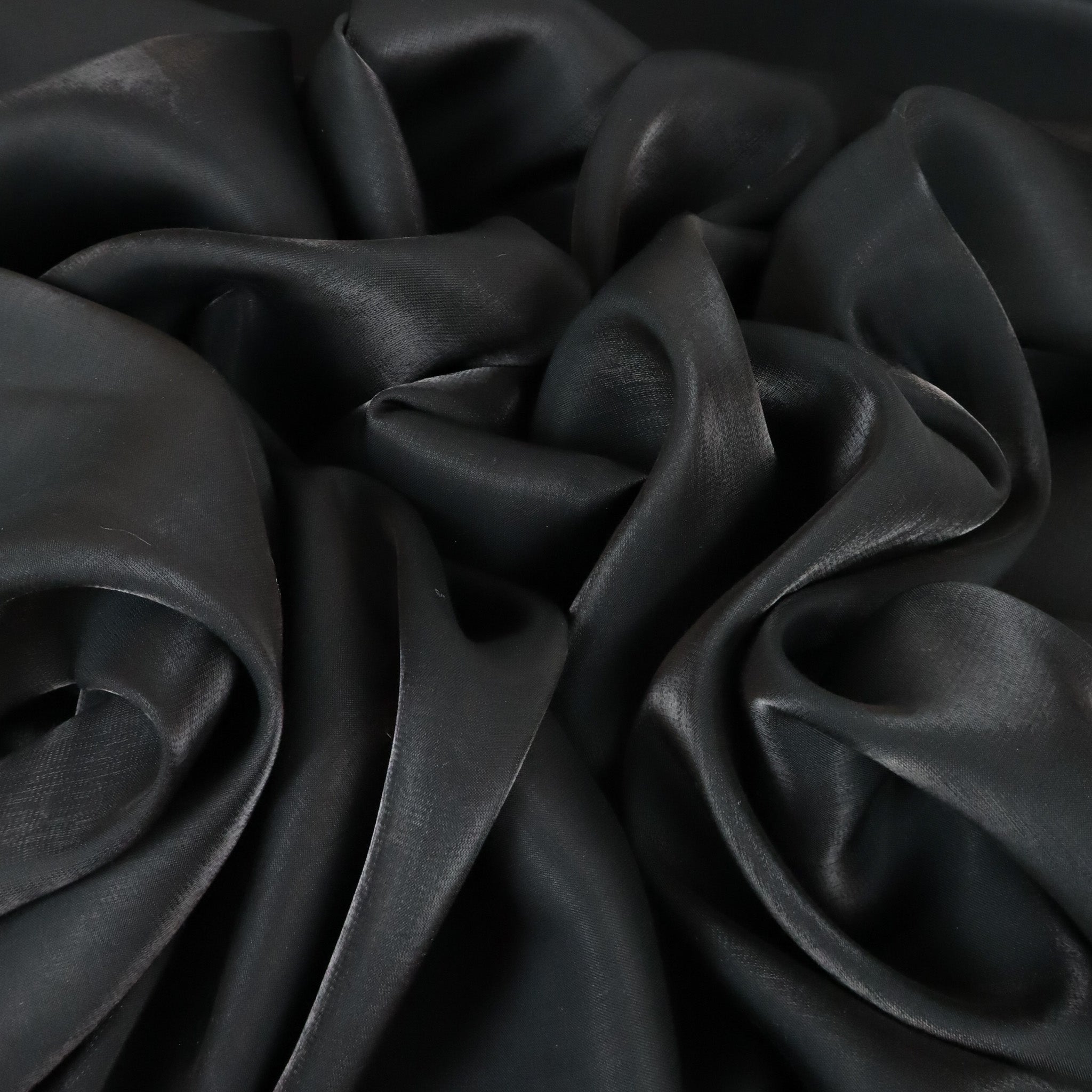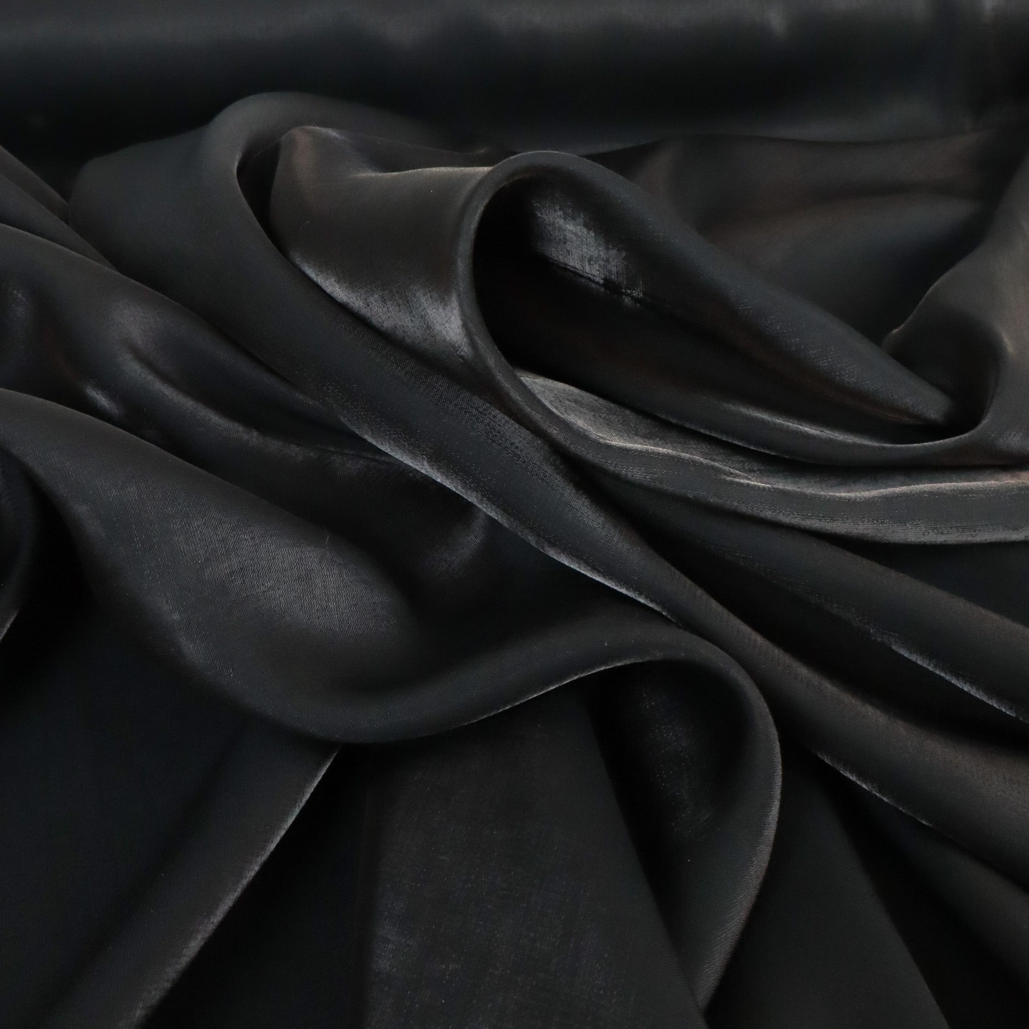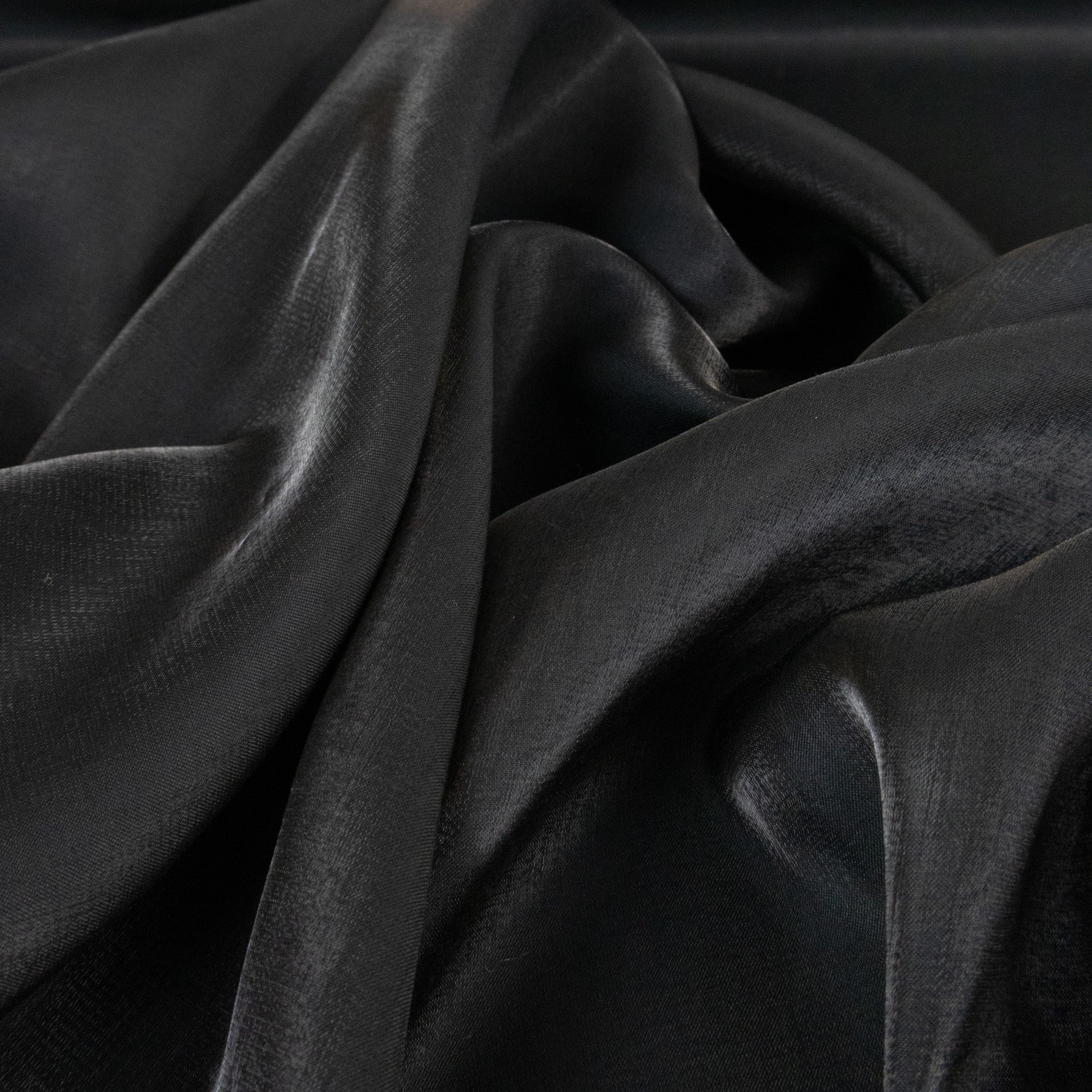 Conga Shot Crepe Deadstock - Black. A lightweight rayon-polyester crepe with a unique iridescent shot finish. Soft with a fluid drape, this deadstock fabric is perfect for fantastical creations, from skirts and dresses to blouses and statement pieces.