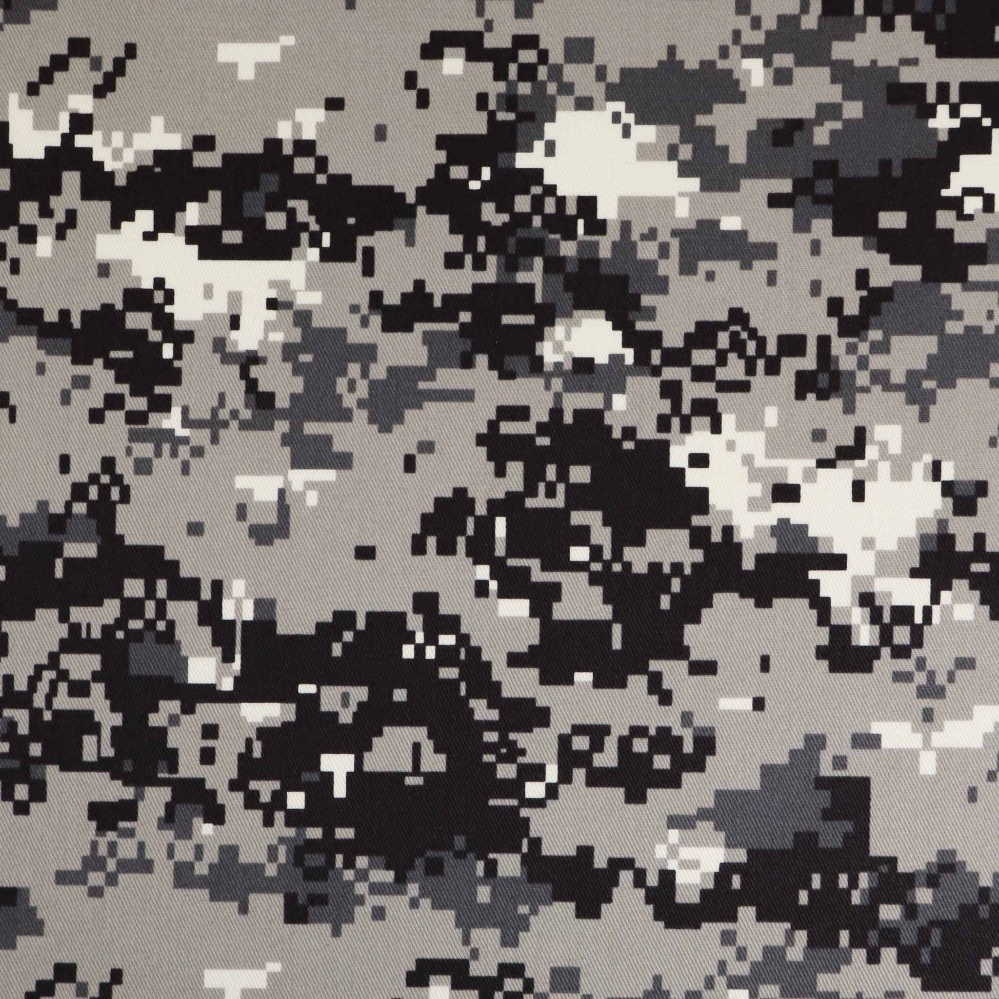 Printed Cotton Drill Deadstock in Digital Grey Camo. A cotton drill featuring a digital camo print in grey, white, and black on a grey base. Durable with a structured hand, it’s ideal for jackets, trousers, bags, and workwear-style projects.