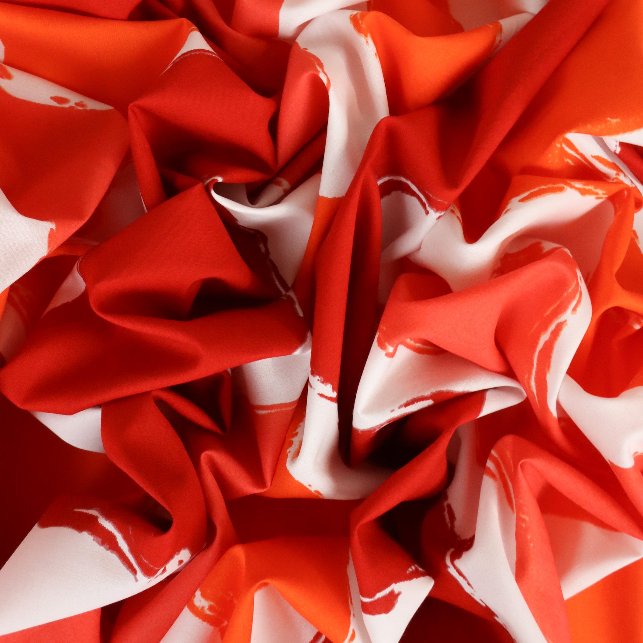 Cotton Abstract Stripe Print - Red Raider Orange Red. A printed cotton featuring a soft hand feel and beautiful crisp drape. This versatile fabric is perfect for dresses, shirts, shorts, or a matching top and pant set, effortless, breathable, and ideal for everyday wear.