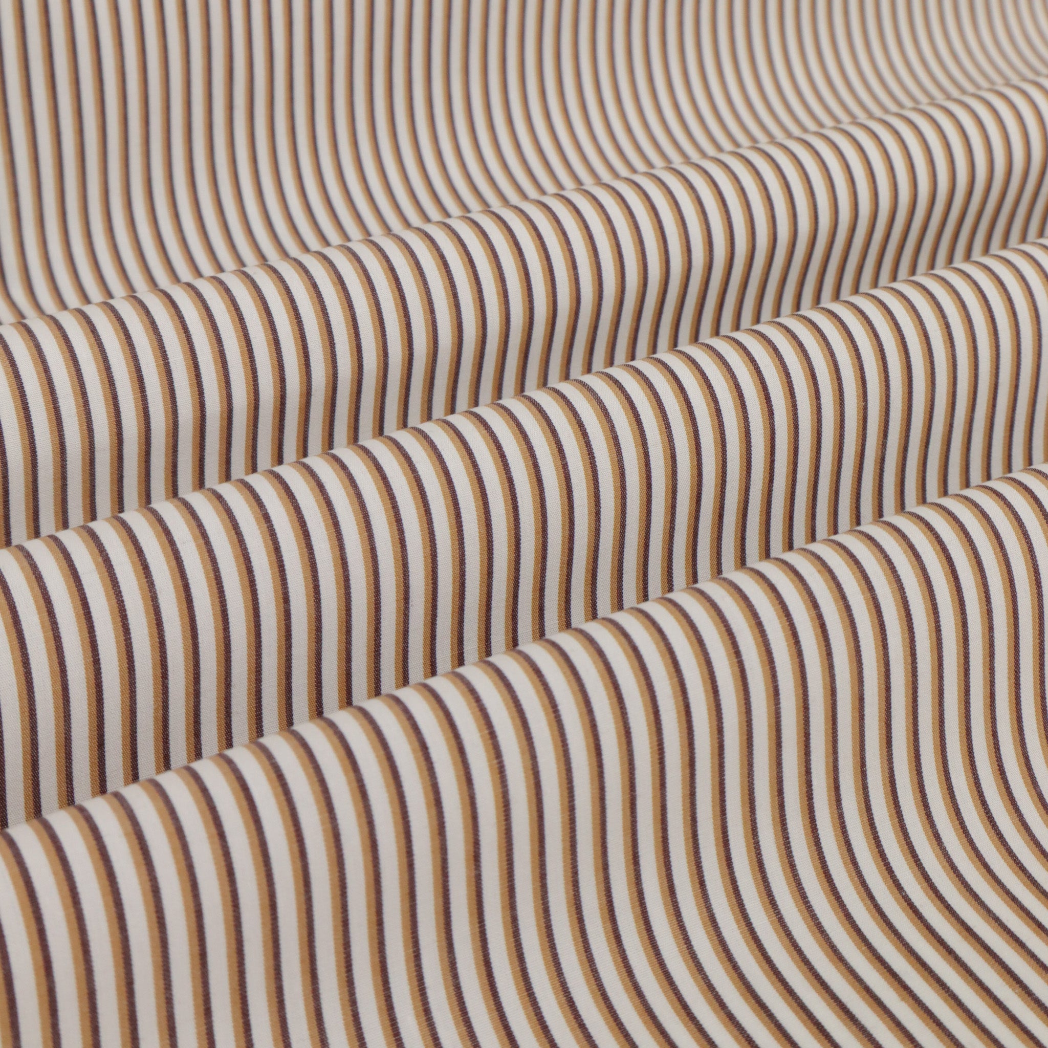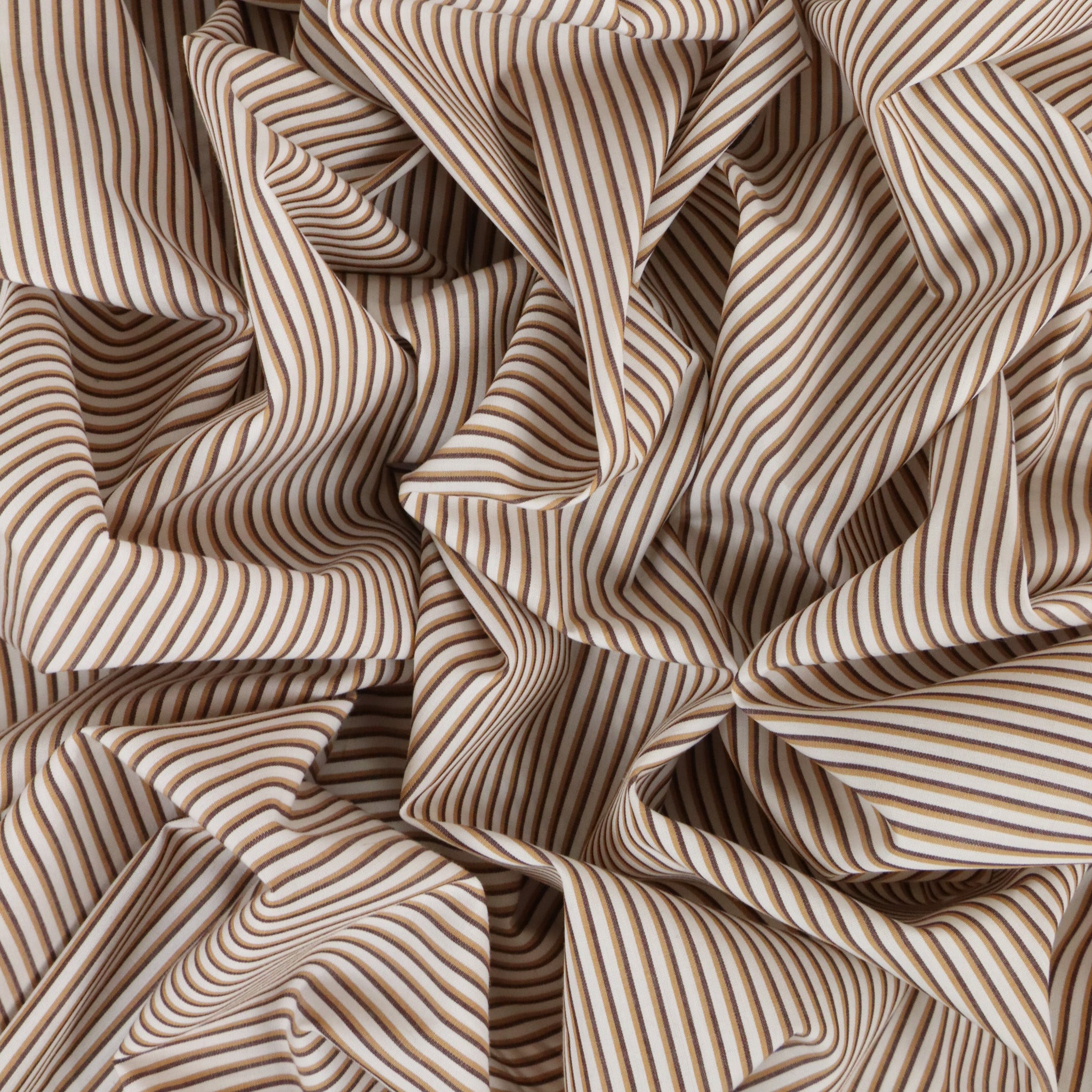 Cotton Yarn Dyed Pinstripe - Rudy. A soft, breathable classic cotton pinstripe in brown and white. Lightweight yet durable, this fabric is versatile and easy to sew. Perfect for shirts, dresses, and skirts. Sourced as a true designer end, available only in limited quantities.