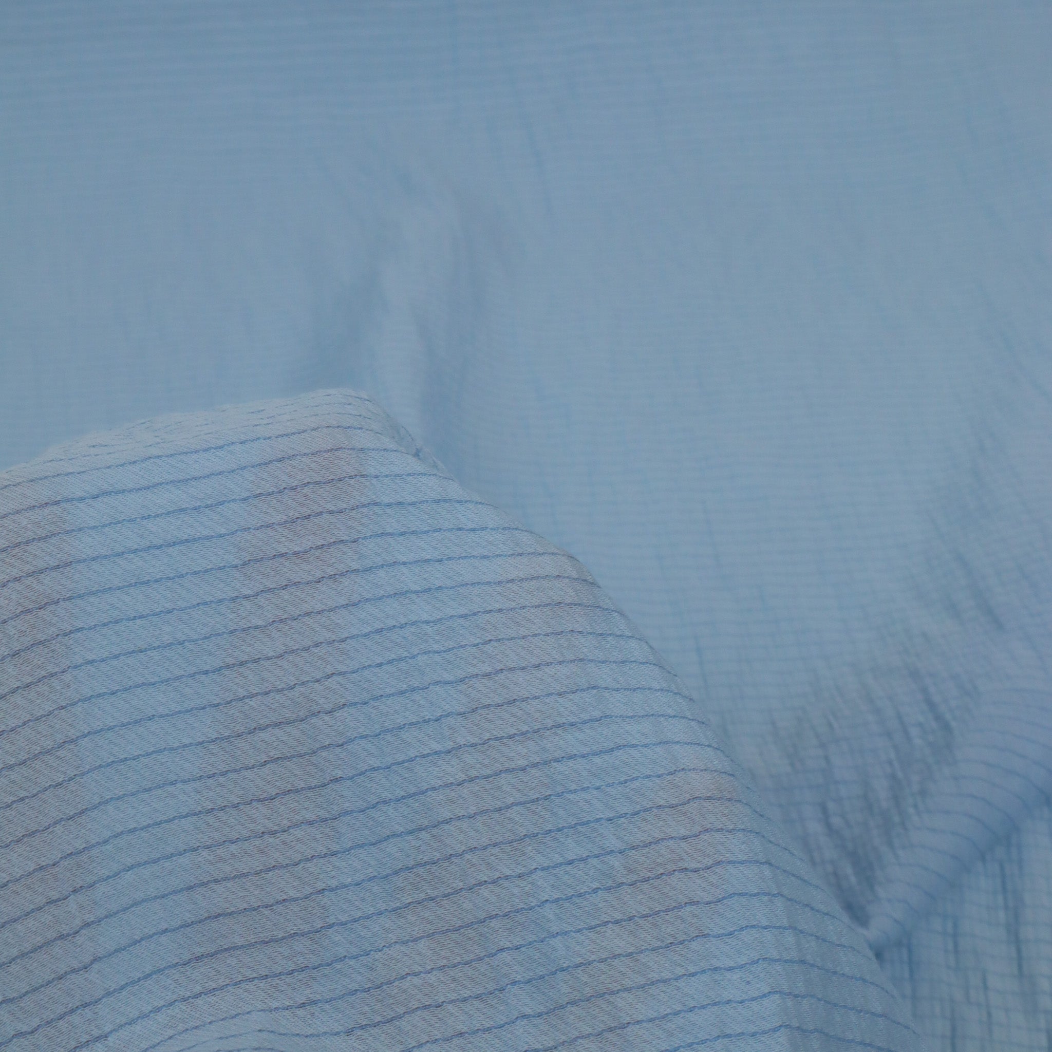 East River Silk Designer End – Baby Blue. A delicate silk in a soft baby blue, woven with a subtle waffle-effect that creates a piqué, shirred-like texture. Lightweight and refined, this fabric is ideal for blouses, dresses, or statement layering. Sourced as a true designer end, available in limited quantities.