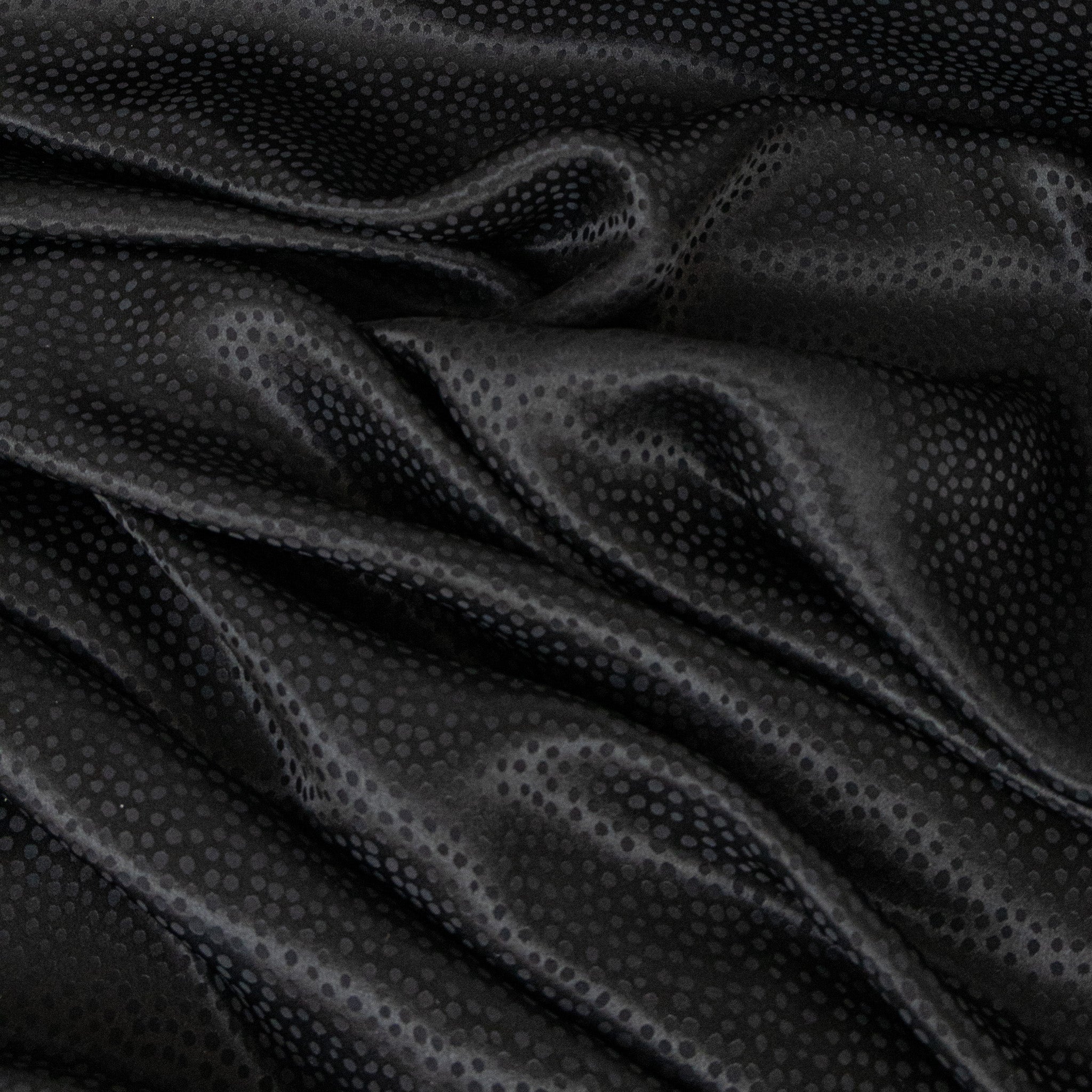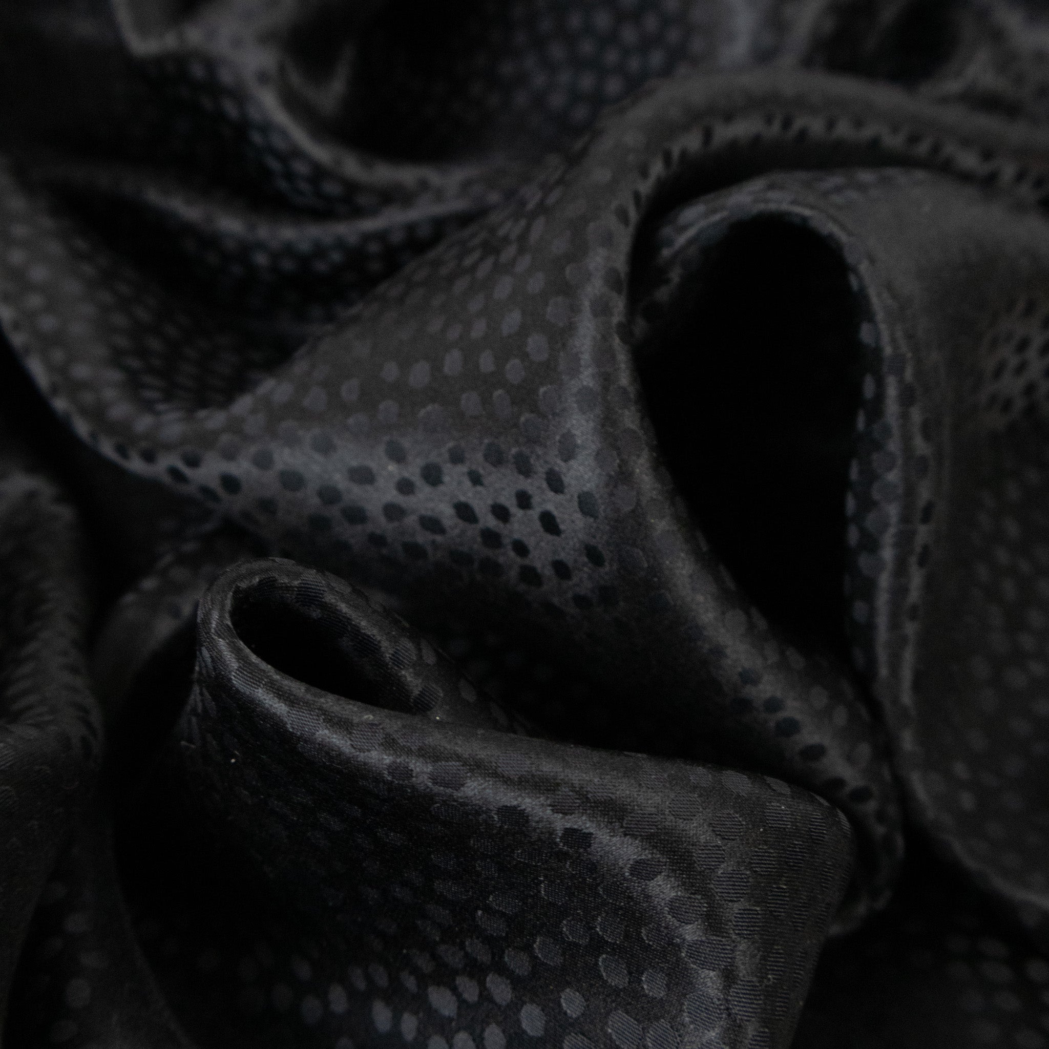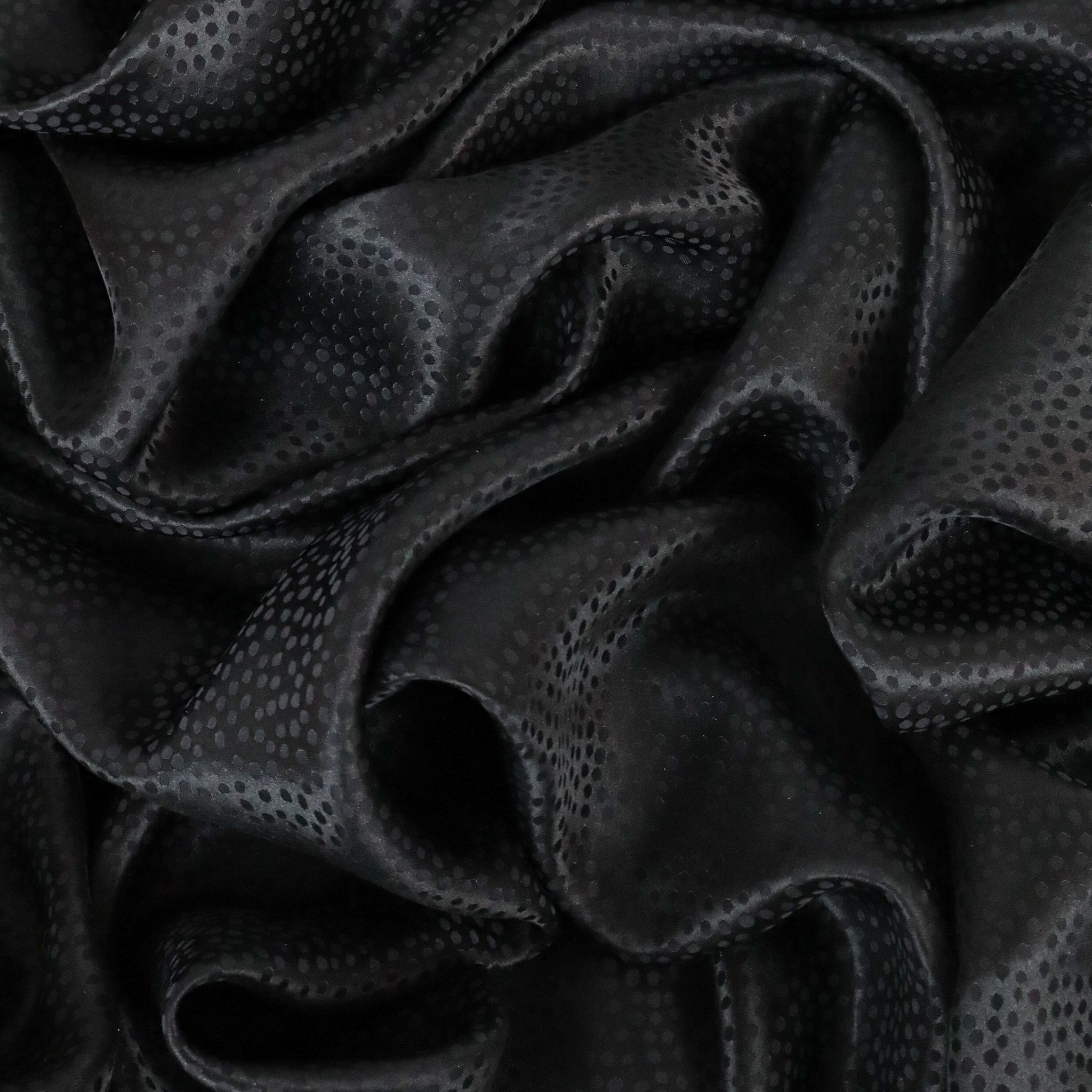 Harlem Silk Dobby Satin Designer End – Black. A refined black silk satin with a dobby weave that adds subtle texture and depth. Smooth, lustrous, and elegant, this fabric is ideal for dresses, evening blouses, skirts, or refined tailoring. Sourced as a true designer end, available in limited quantities.