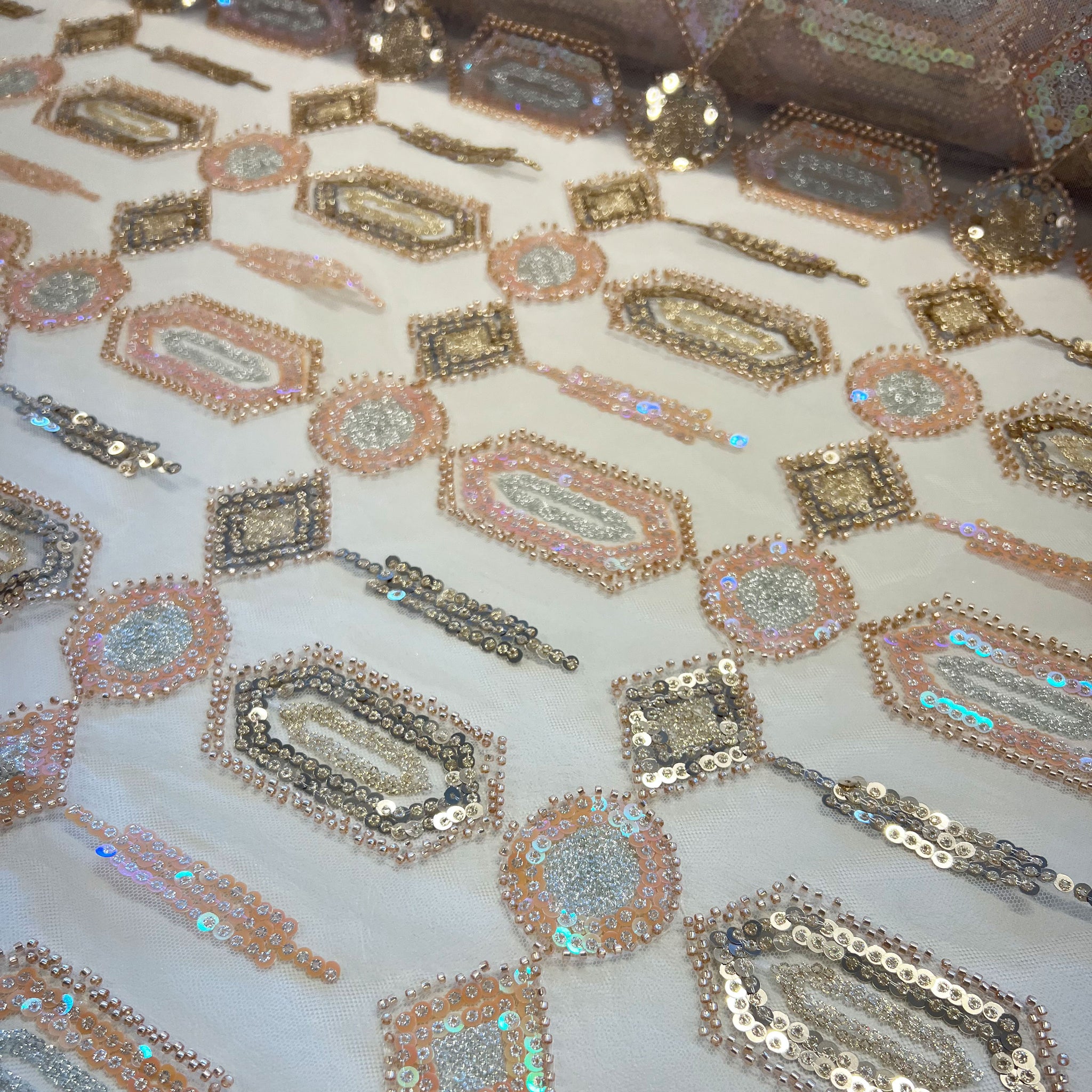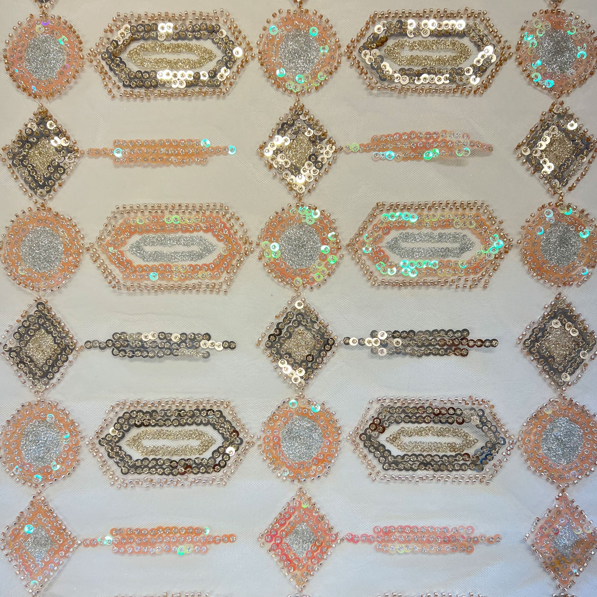 Hypnotised Sequins - Champagne. A polyester mesh base with silver and gold sequins and pinky-peach beading in diamond and circle formations. Live out your sequin dreams in this stunning sequin! Perfect made up as almost any garment – dresses, capes and bold jackets!