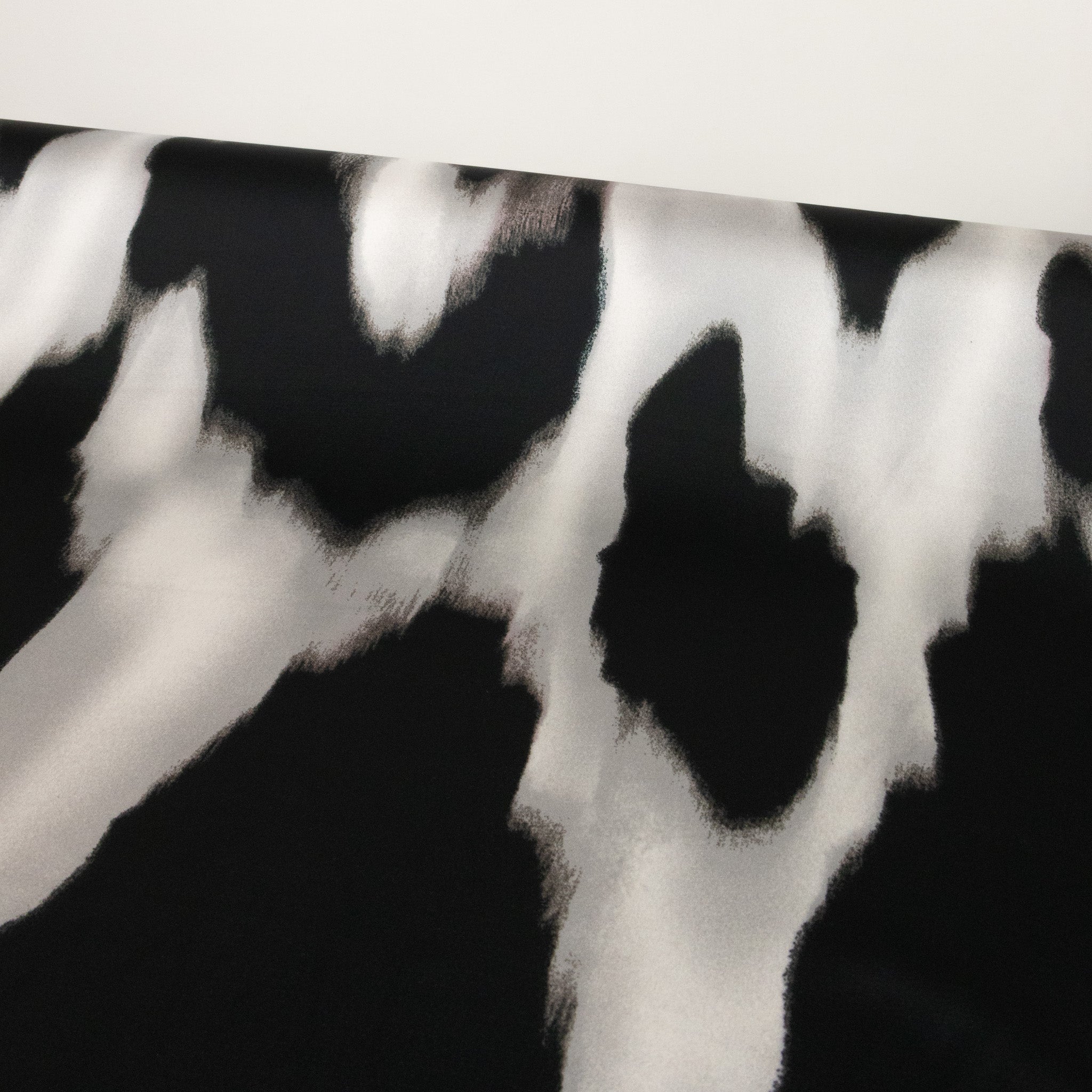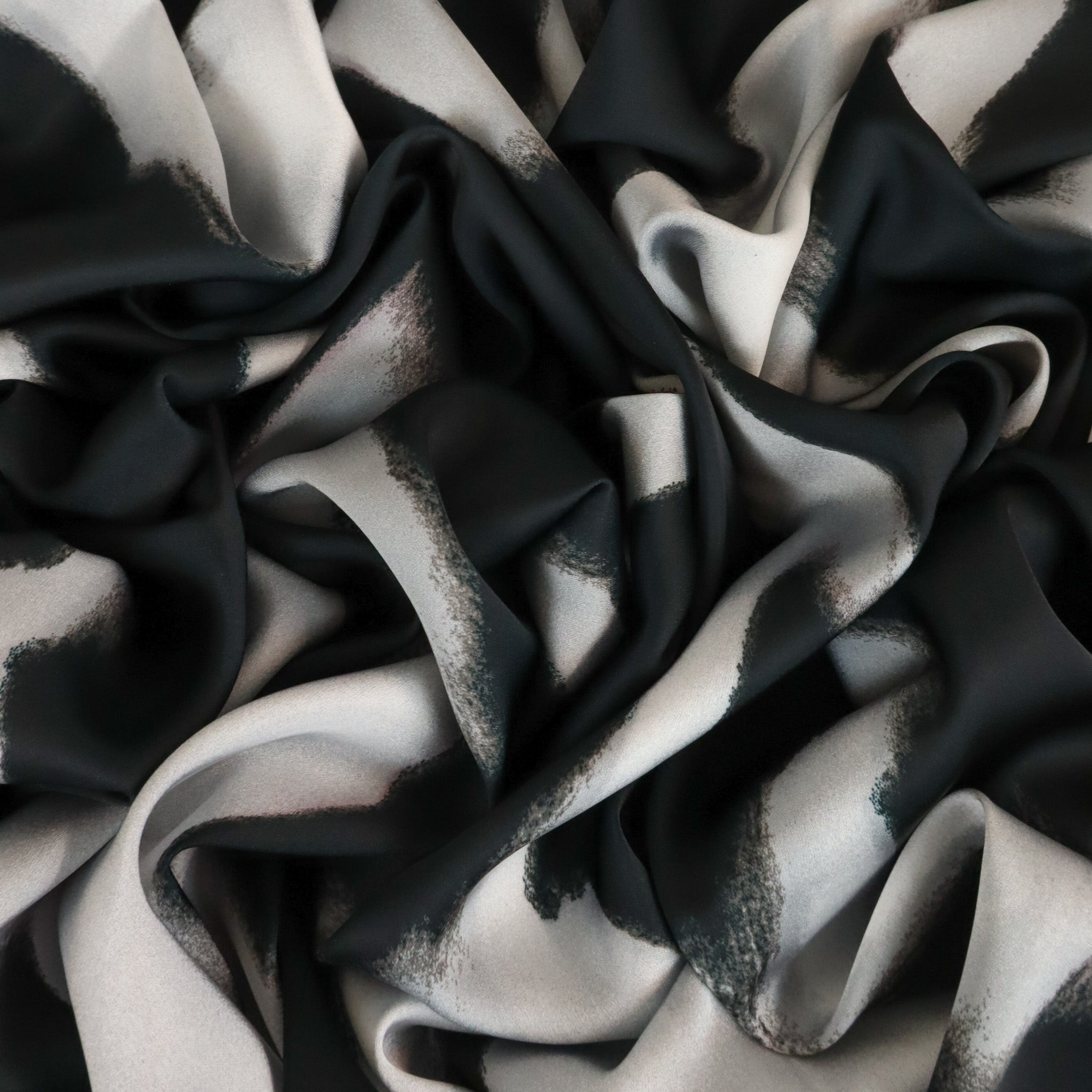 Polyester Printed Satin Deadstock - Money Shot. An abstract black-and-white printed satin from our limited deadstock range. Smooth with a soft sheen and a fluid, elegant drape, perfect for tops, dresses, skirts, or even as a playful lining.