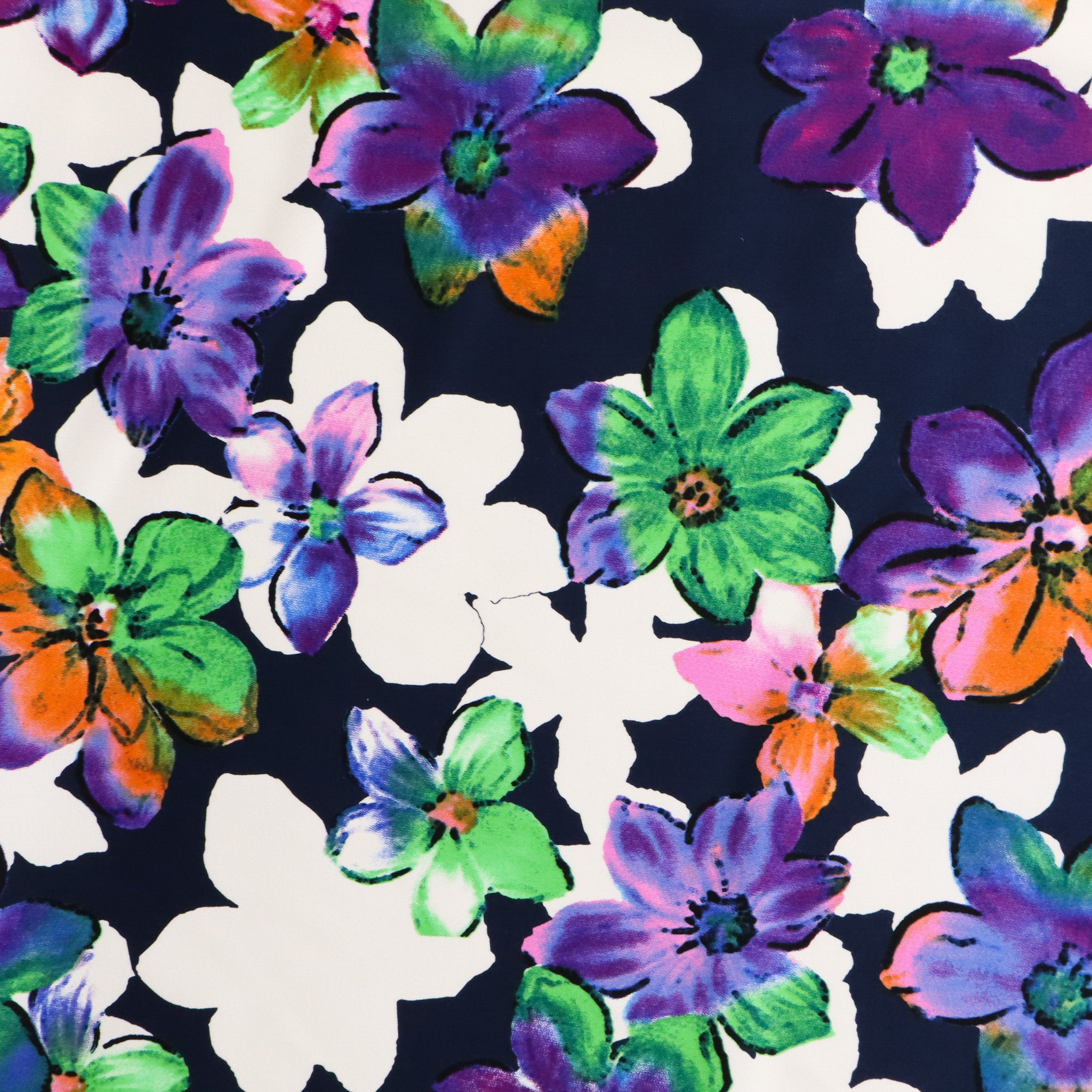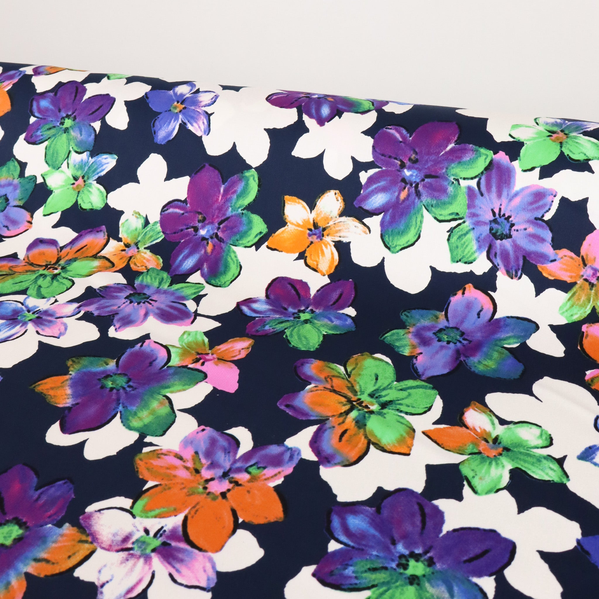 Stretch Cotton Sateen Print – Mandevilla. A midweight woven cotton–spandex sateen featuring a smooth, lustrous finish thanks to its sateen weave, which creates a soft hand feel and subtle sheen. Comfortable with gentle stretch, it’s perfect for shirts, skirts, and dresses.