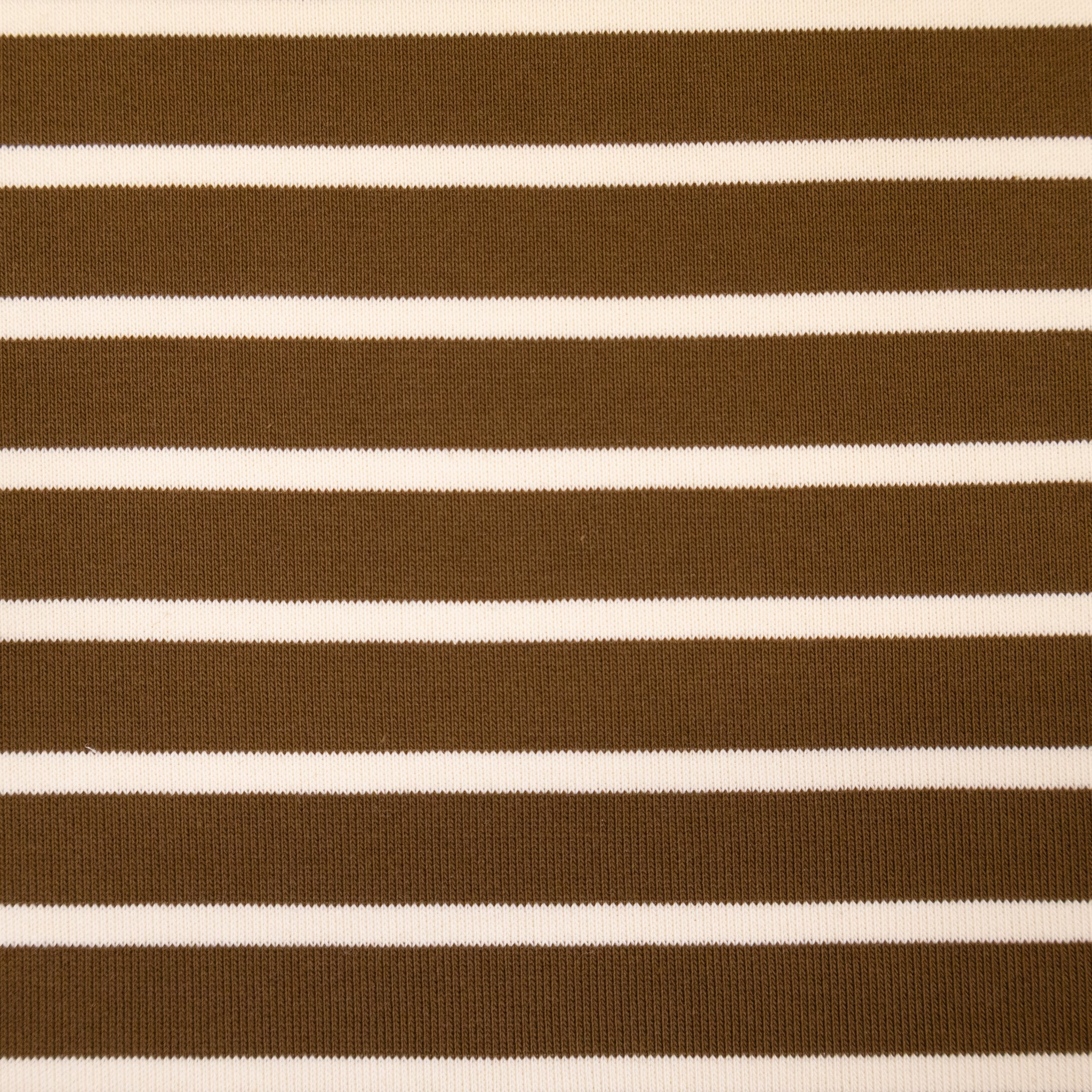 Striped Loop Back Sweatshirt in Walnut & White. This is a cotton rich fabric with a soft pile on the face side and a looped back. Often referred to as a French Terry. It is a midweight knit making it a great choice for a layering. Suitable for sweatshirts and loungewear.