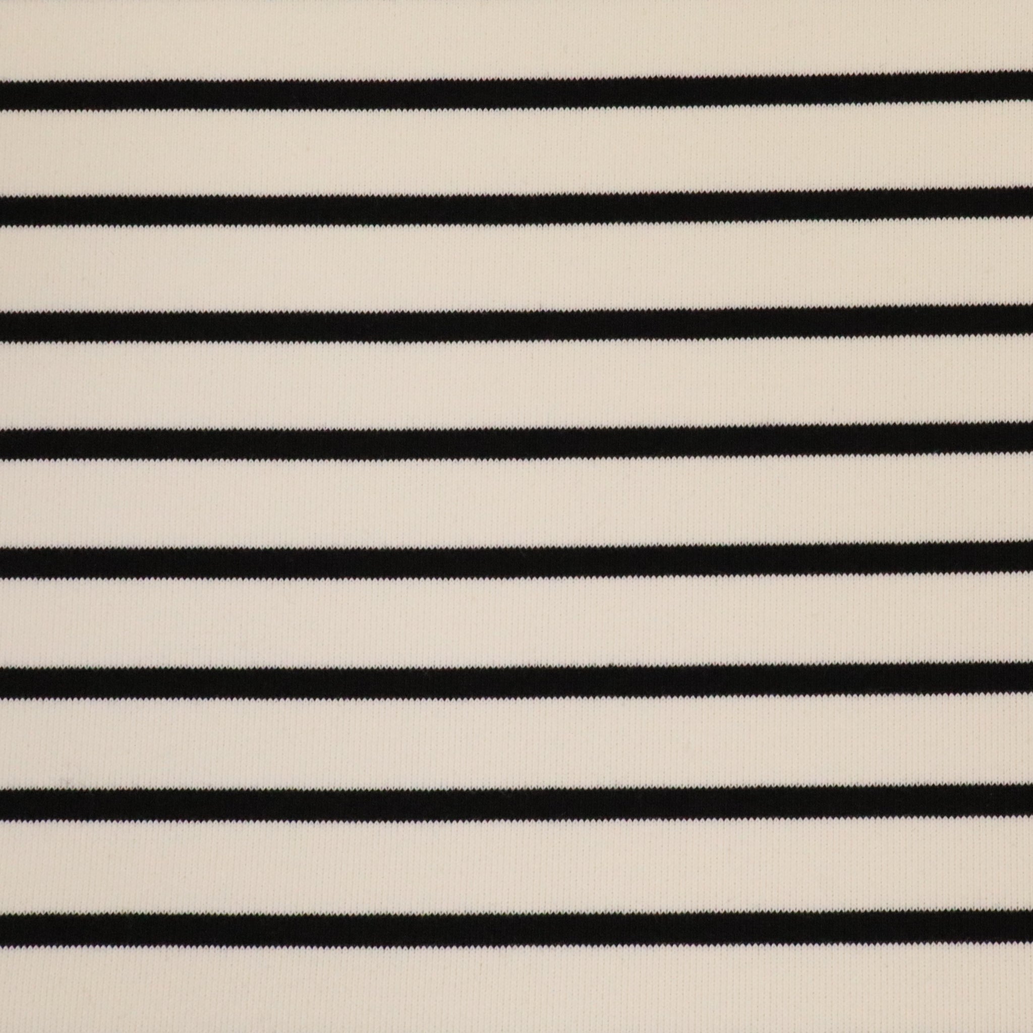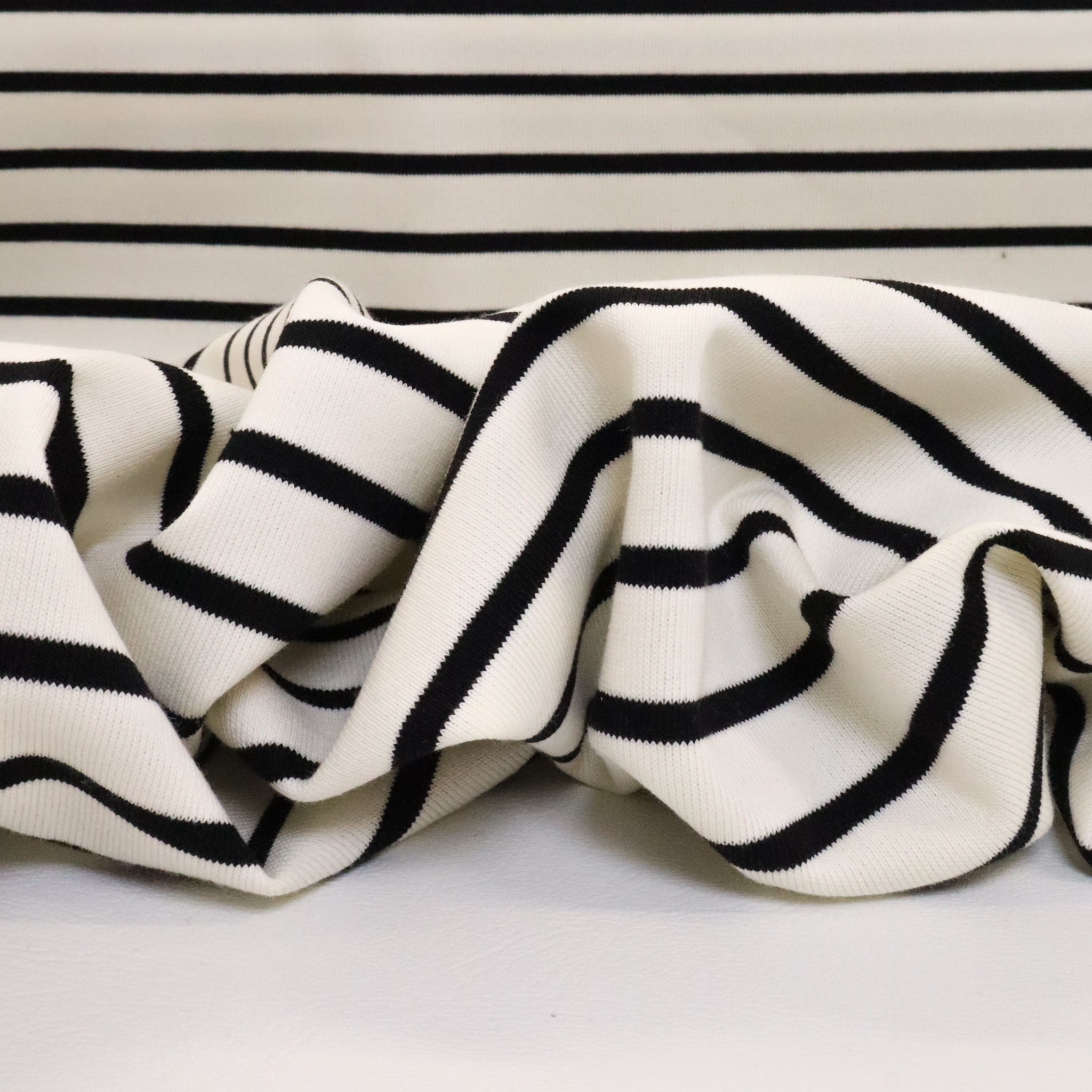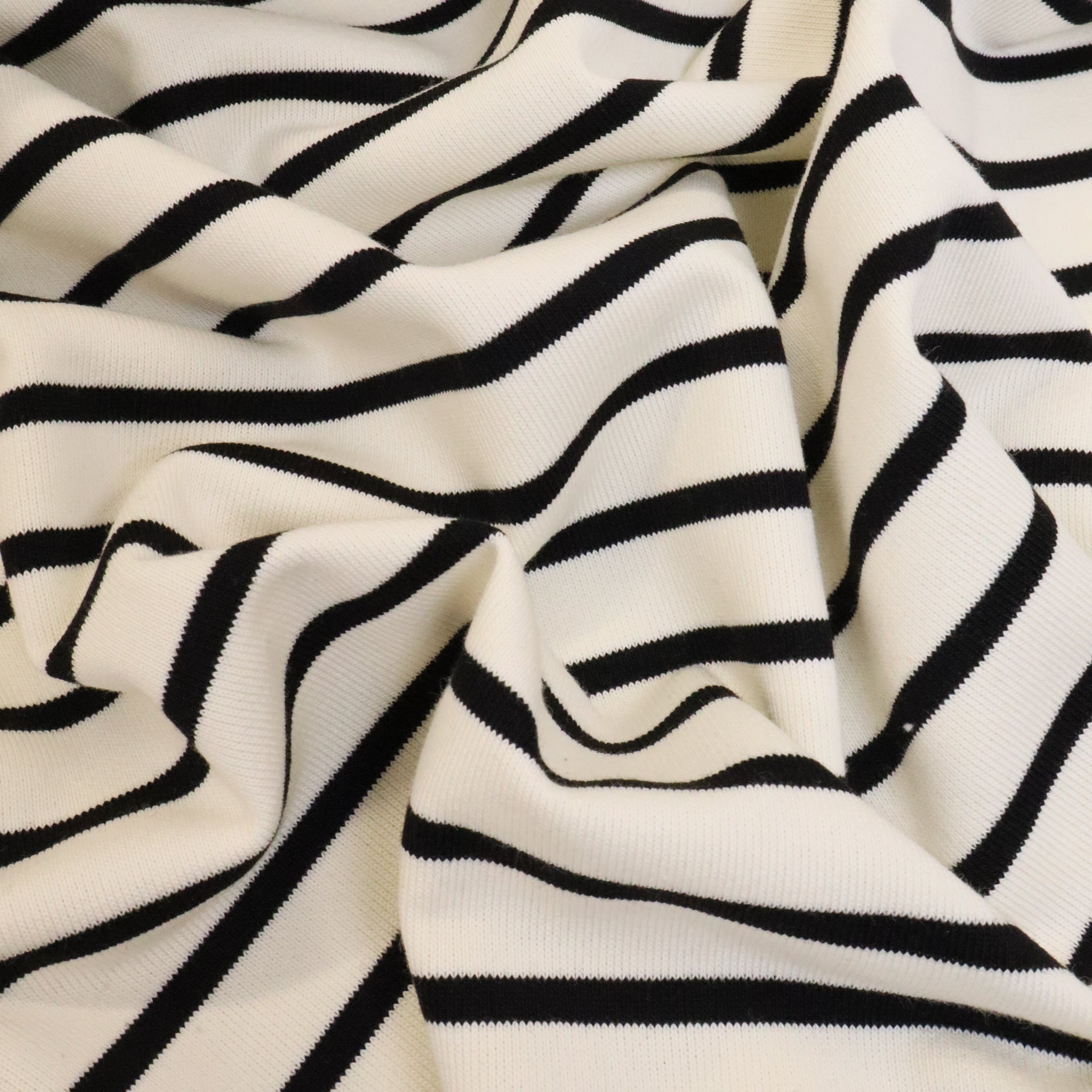Striped Loop Back Sweatshirt in White/Black. This is a cotton rich fabric with a soft pile on the face side and a looped back. Often referred to as a French Terry. It is a midweight knit making it a great choice for a layering. Suitable for sweatshirts and loungewear.