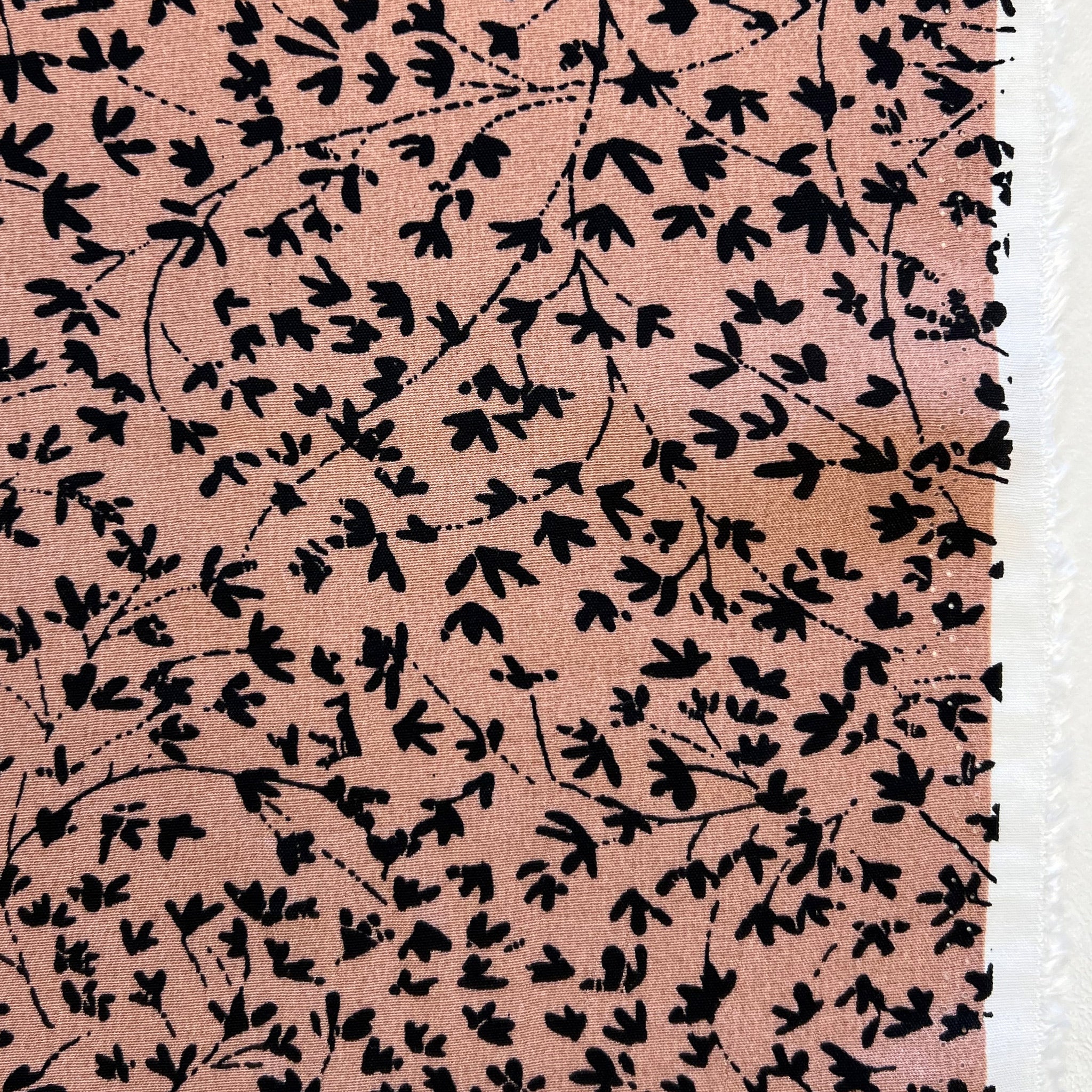 Tolovana Printed Viscose Crepe in Dusky Beige. A delightful ditty printed viscose crepe with a dusky, pinky-beige base and black vine floral. Perfect for drapey tops and dresses.