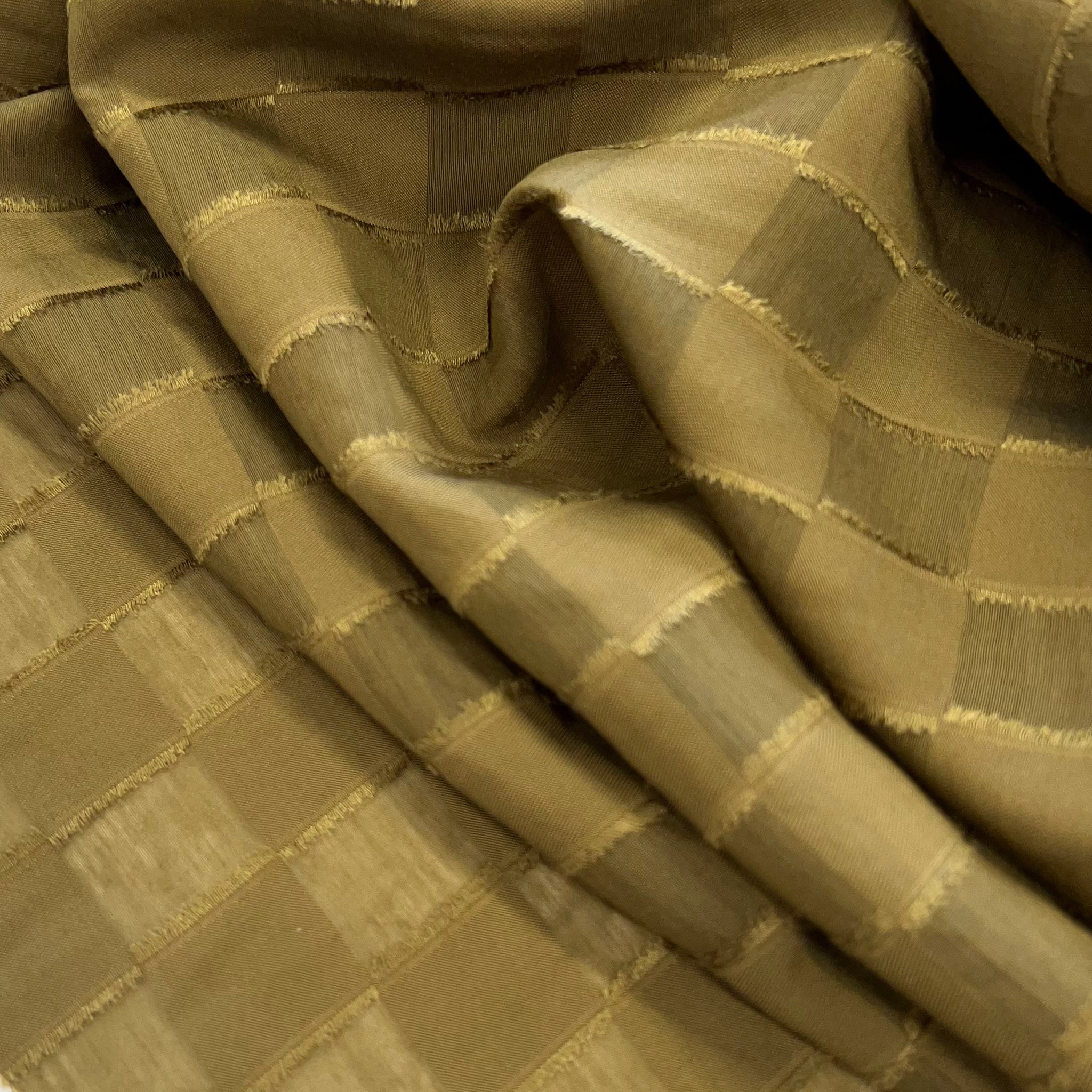 Viscose Nylon Clipped Square Jacquard in Olive. A lightweight, viscose-nylon woven in with a clipped check jacquard. This fabric is suitable for blouses and lined dresses. Use a cool iron.