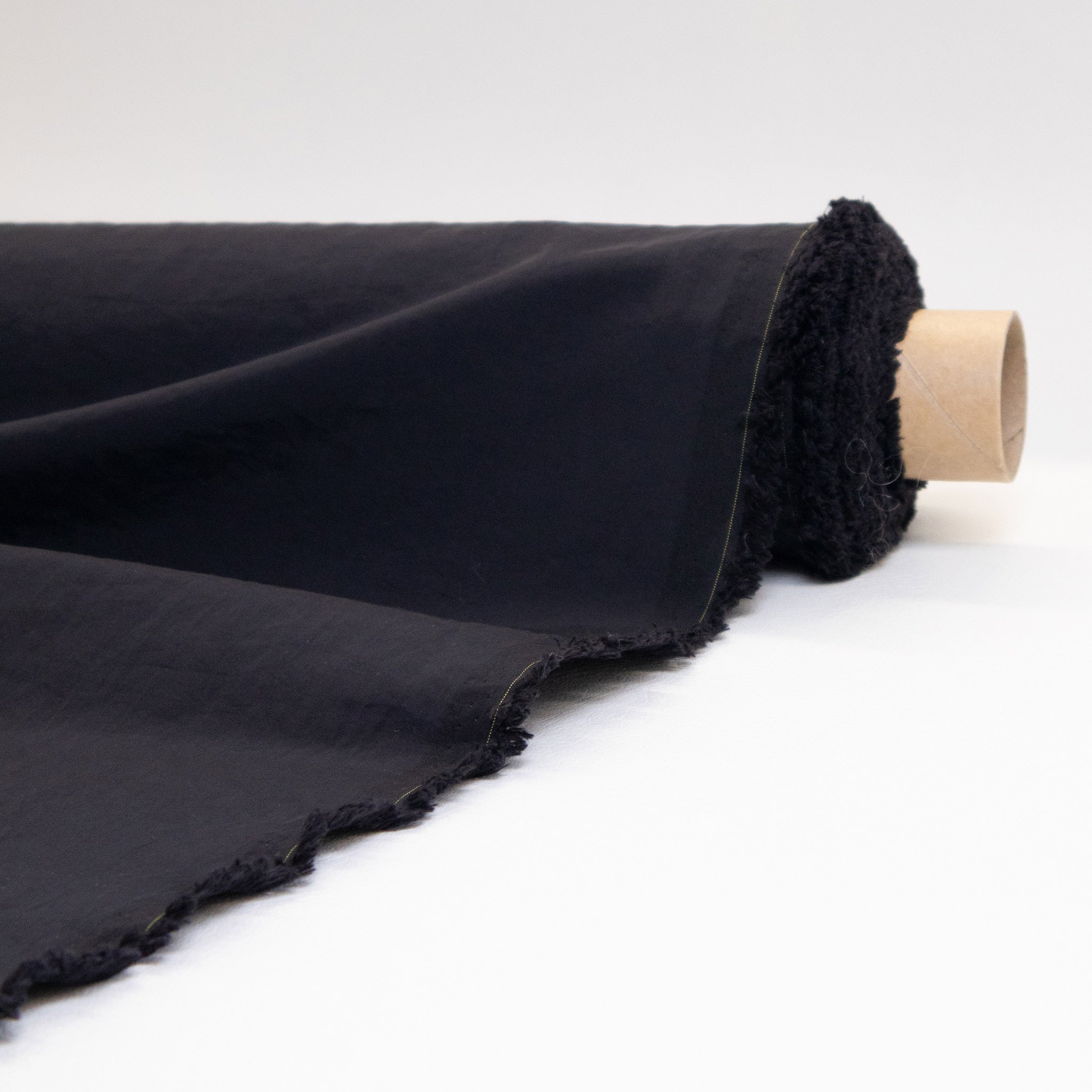 Showerproof Nylon in Black. This lightweight nylon fabric has a soft feel and a gently creased, washed finish - ideal for achieving that cool, utilitarian look. Great for jackets, trench-style coats, windbreakers, pants, skirts, shorts, and hats. For extra comfort, consider adding a lining.