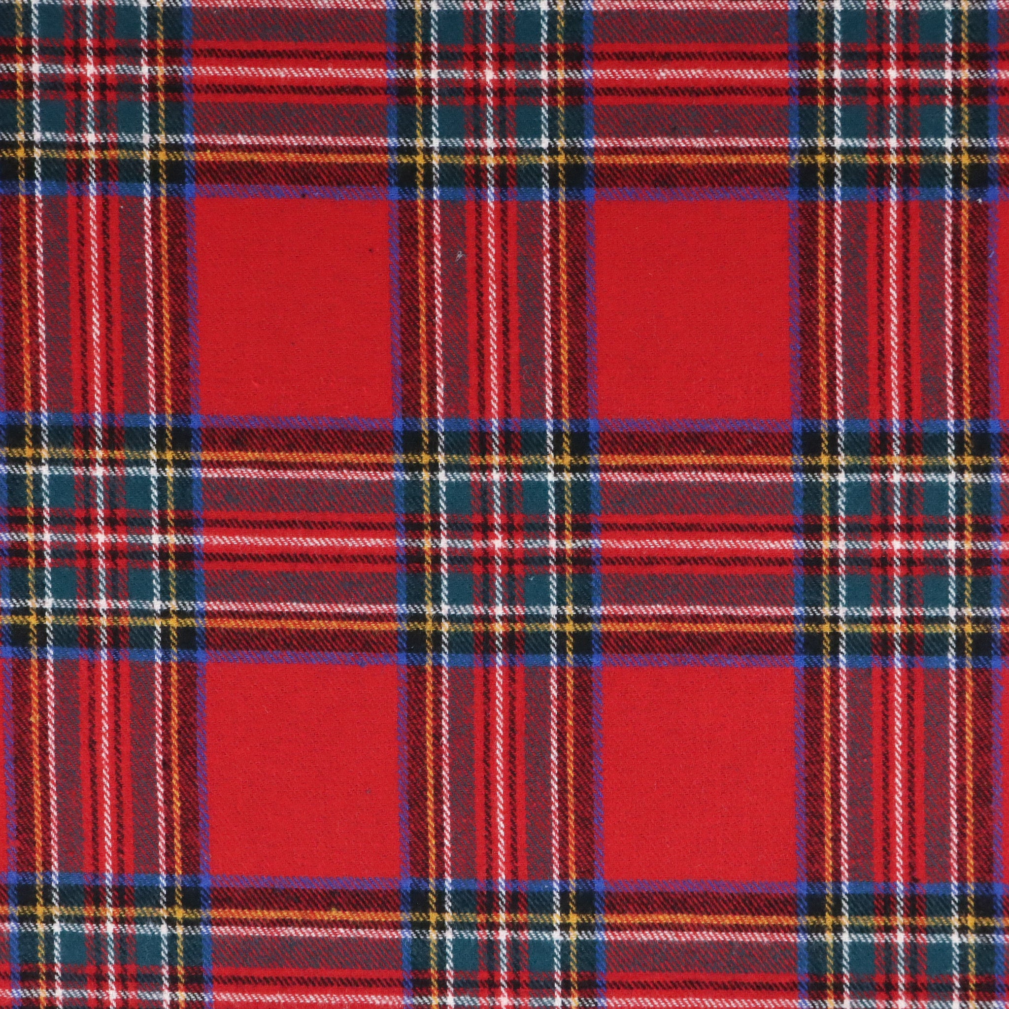 The classic plaid check combines blue, orange, green, white and orange on a red base. Ideal for shirts, lounge sets, and cosy pyjamas.