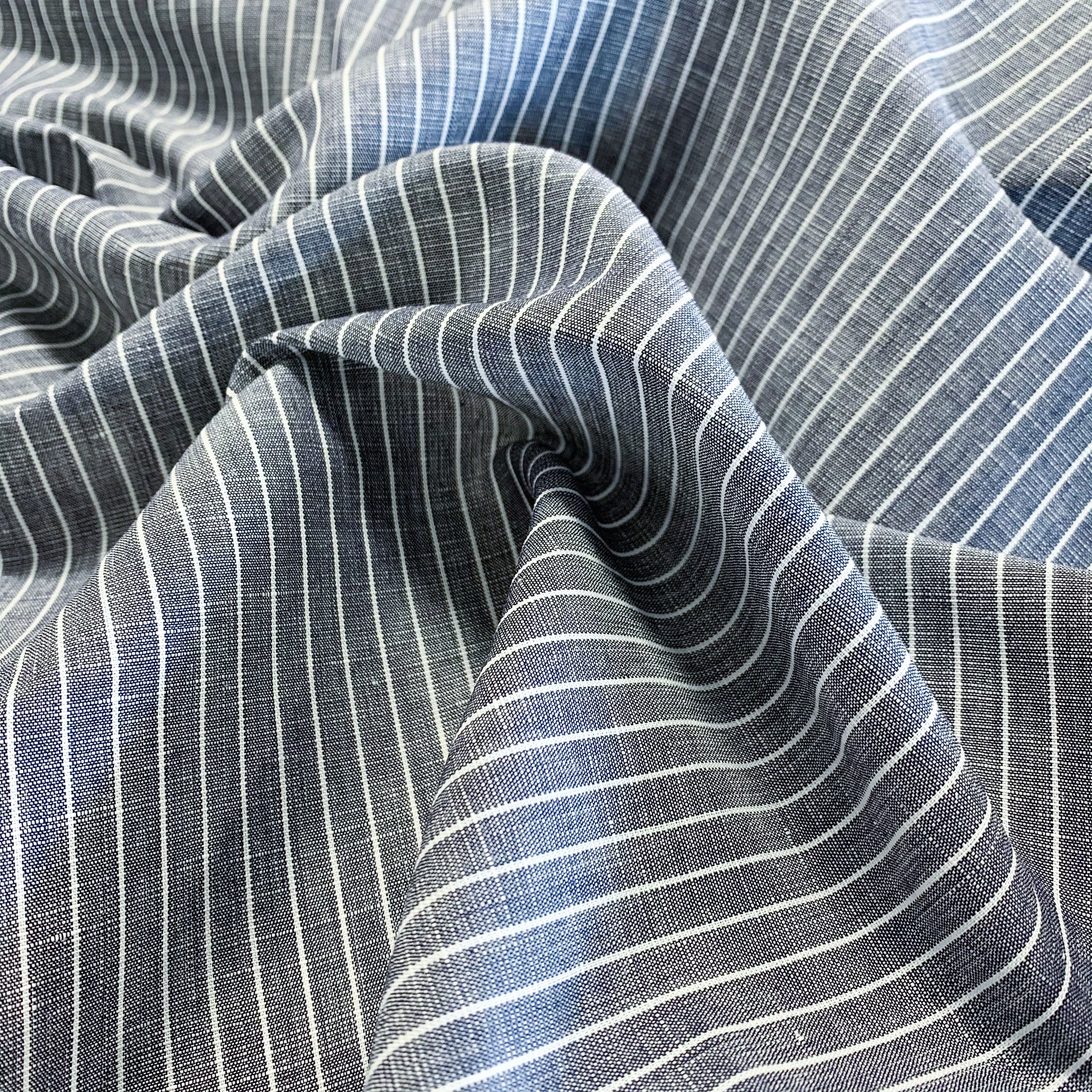 Close Weave Gauze Shirting in Navy. A structured, close-weave gauze with a subtle white vertical pinstripe. Crisp yet breathable, making it ideal for shirts, full dresses, and kaftans.