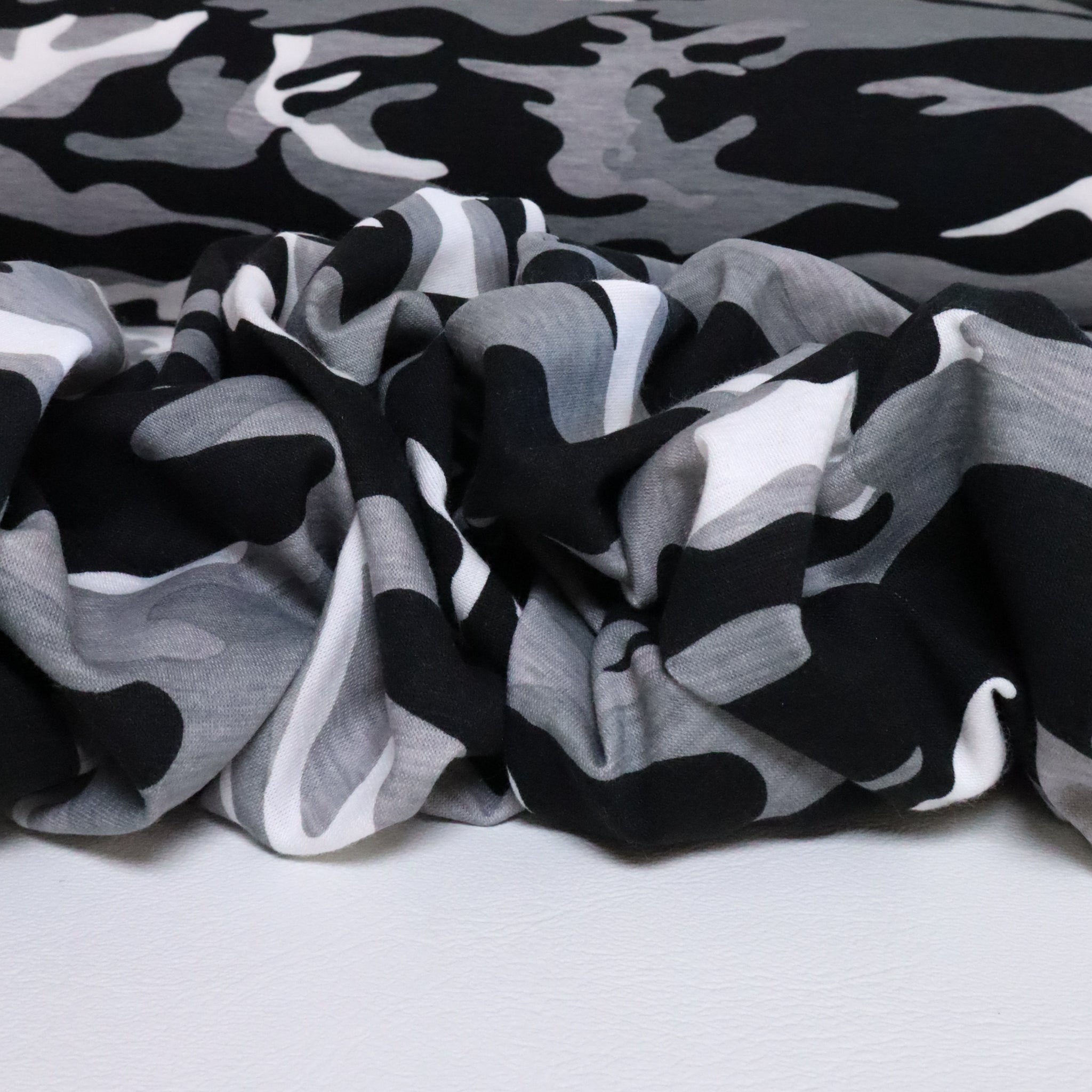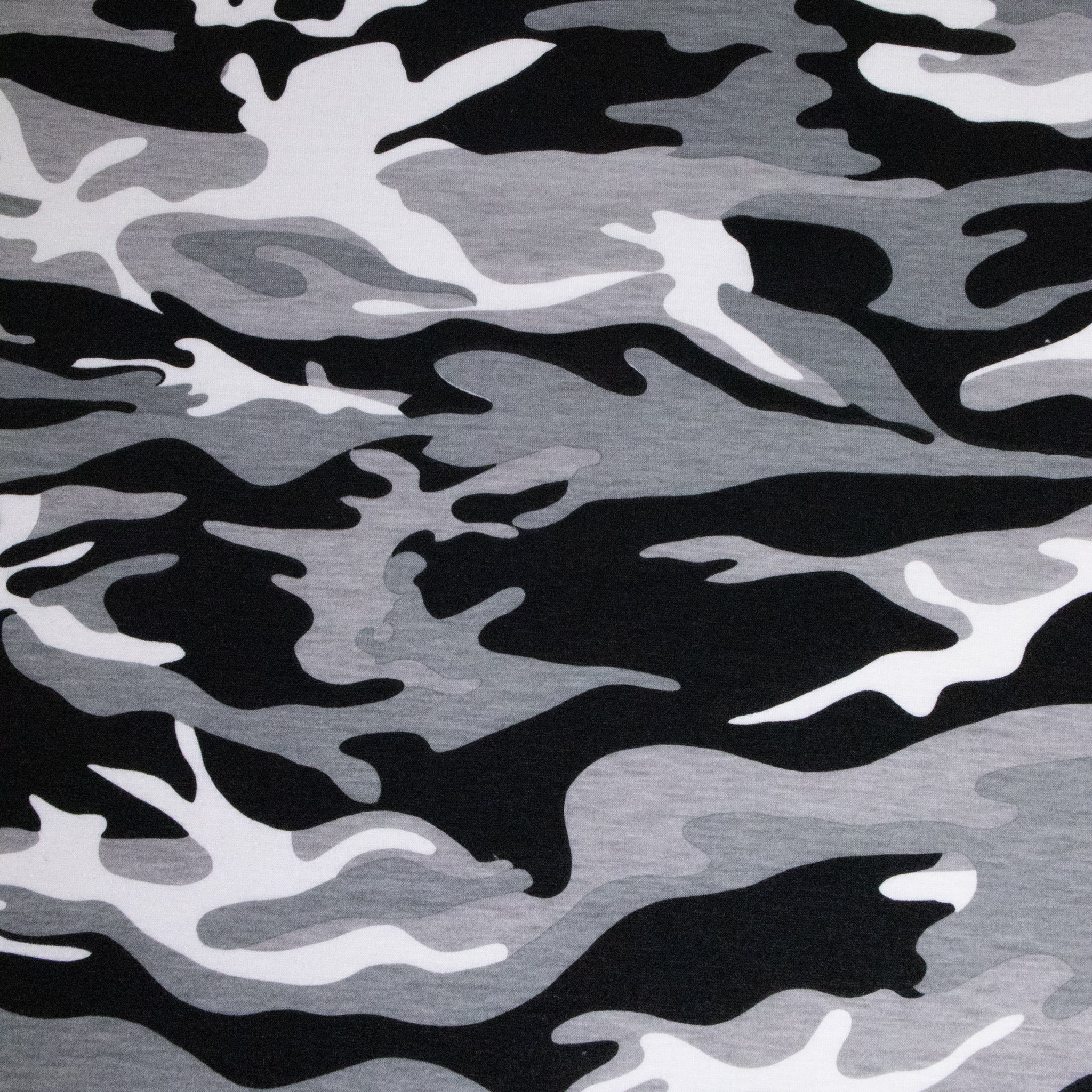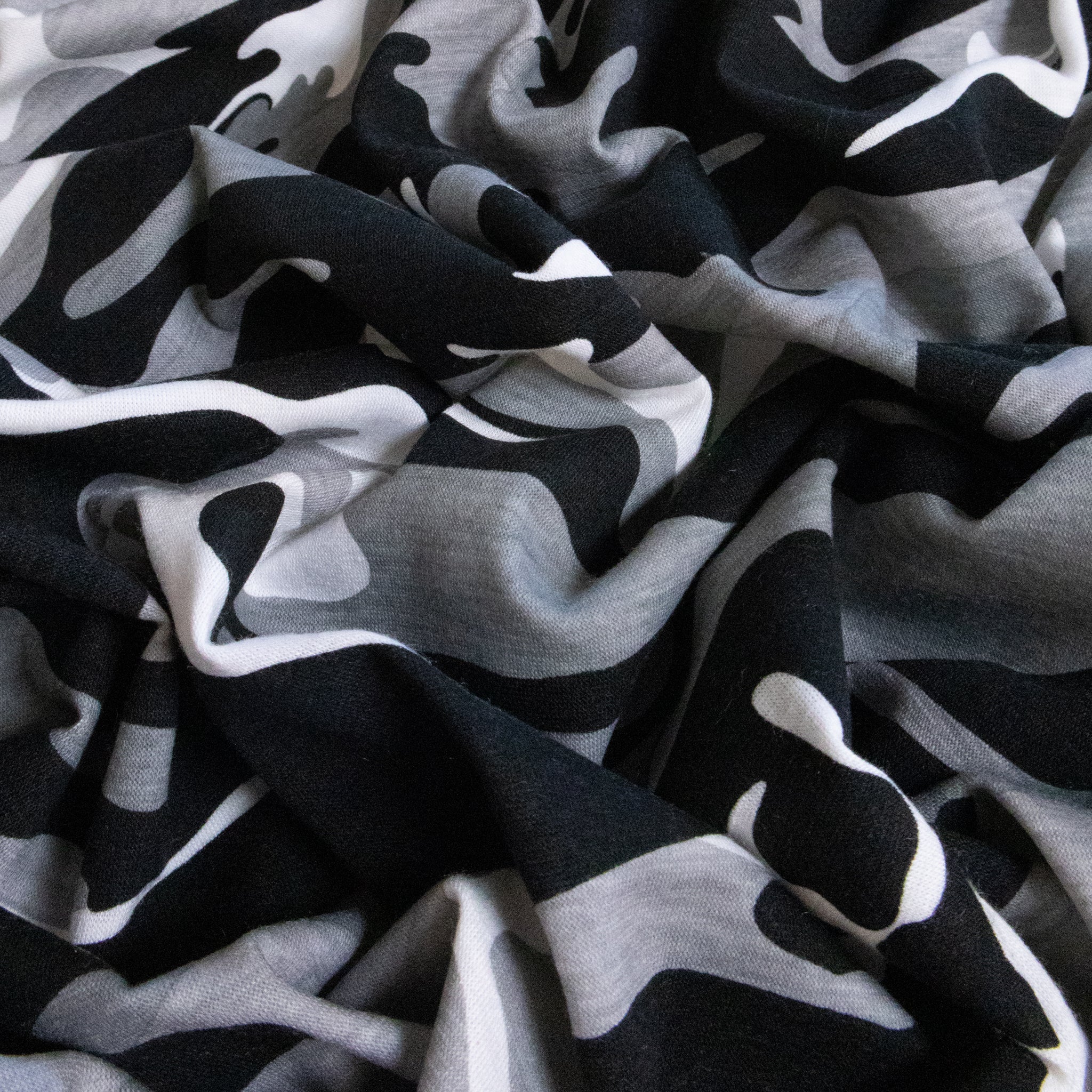 Cotton Camo T-Shirting Single Jersey – Black/White. A soft, pure cotton single jersey printed with a black-and-white camo design. Comfortable and breathable, this knit is ideal for t-shirts, casual dresses, loungewear, and pyjamas.
