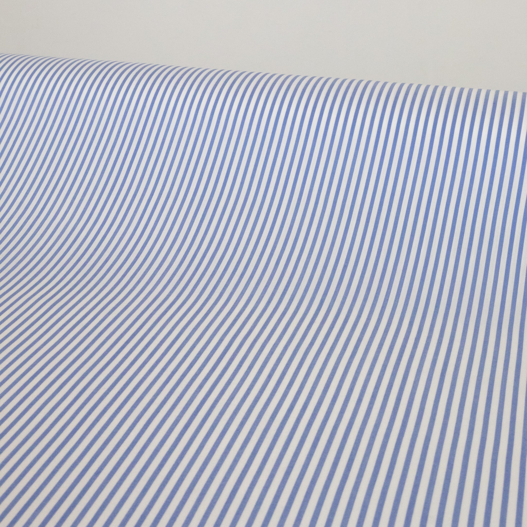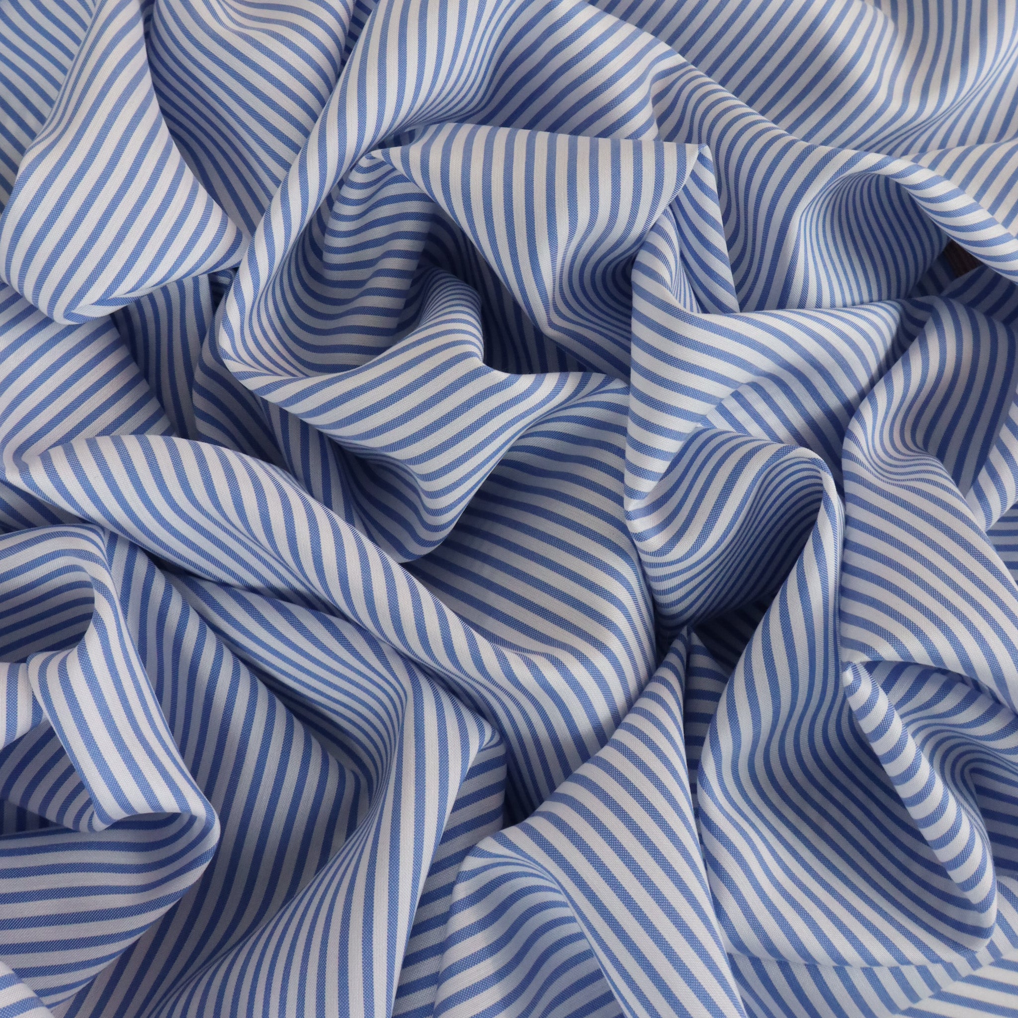 Harrow Rayon Viscose Pinstripe Shirting - Sky. A soft, fluid rayon–viscose shirting featuring a classic sky-blue pinstripe. Lightweight with a beautiful drape, it’s ideal for shirts, blouses, dresses, and relaxed tailoring.