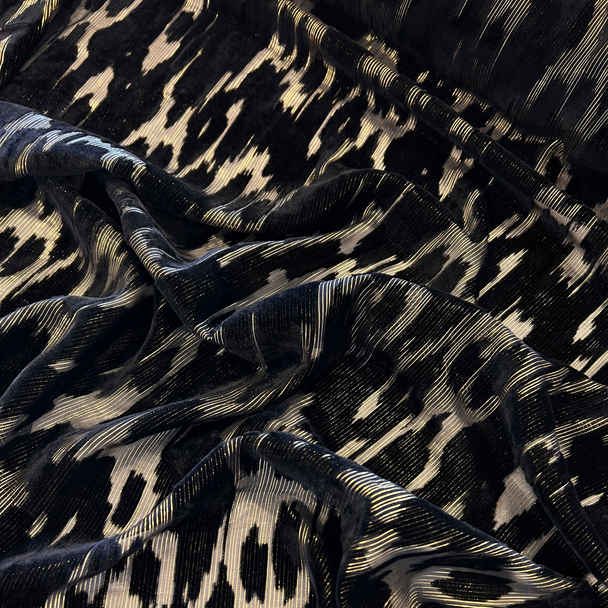 Heartbeat Viscose Nylon Burnout in Black and Gold. A black velvet burnout with an animal print patterned velvet pile on a gold lurex thread base. Ideal for a lined or unlined slip dress or skirt, or a dressy blouse.