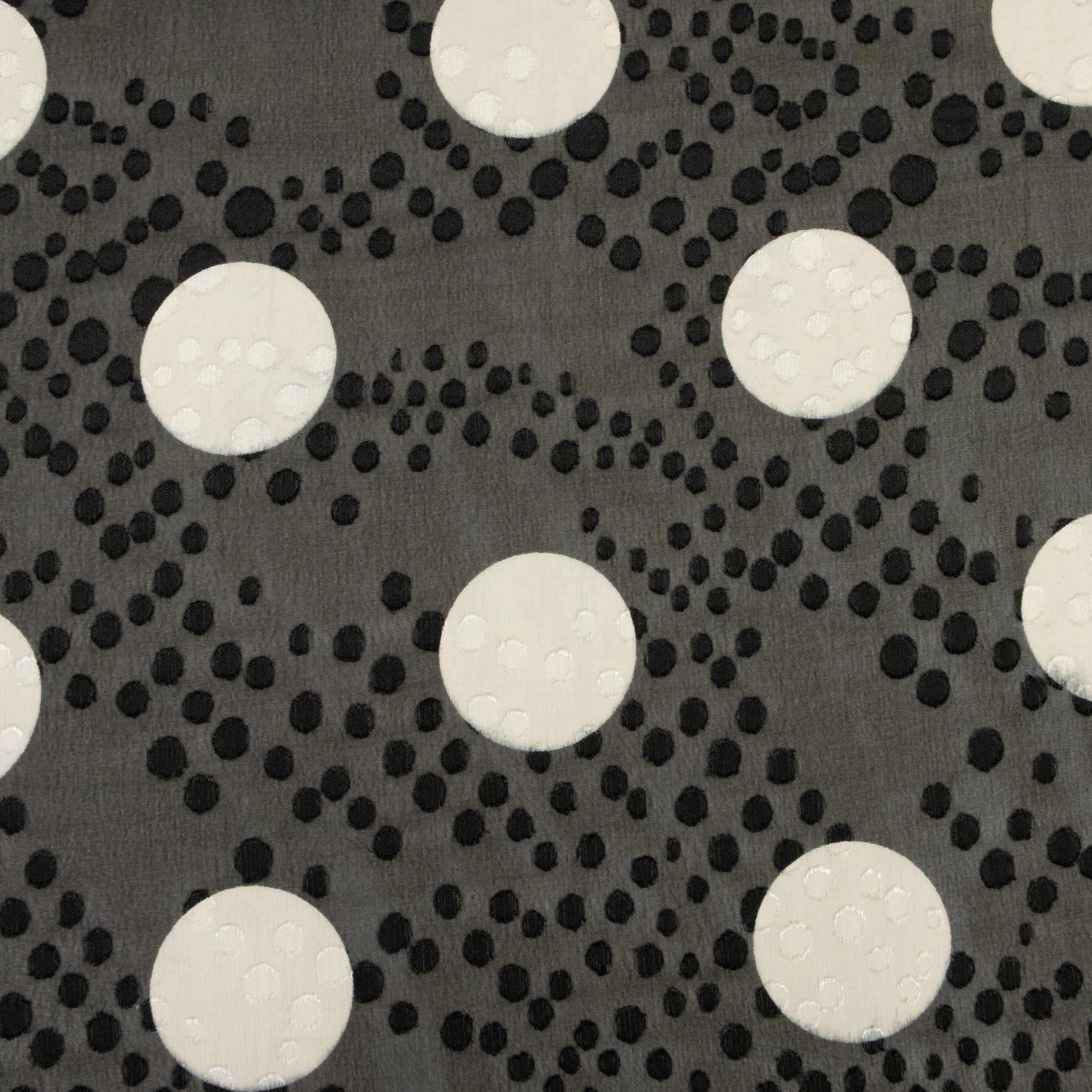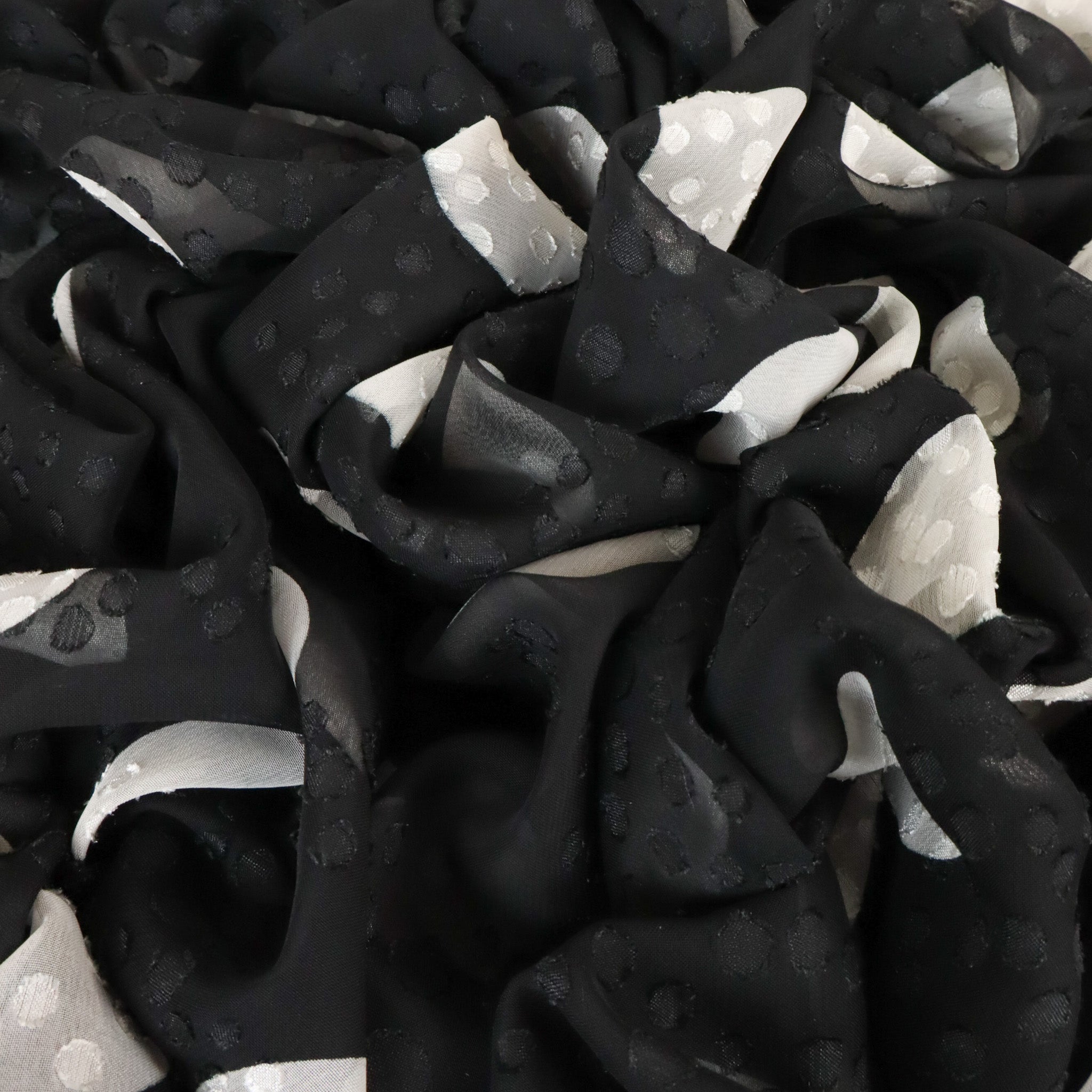 Jacquard Spot Chiffon Deadstock - Apollo Black. A lightweight polyester chiffon featuring a jacquard weave of white spots with smaller black spots scattered throughout. Soft, sheer, and airy, this deadstock fabric is perfect for blouses, dresses, and layering pieces with a touch of texture and movement.