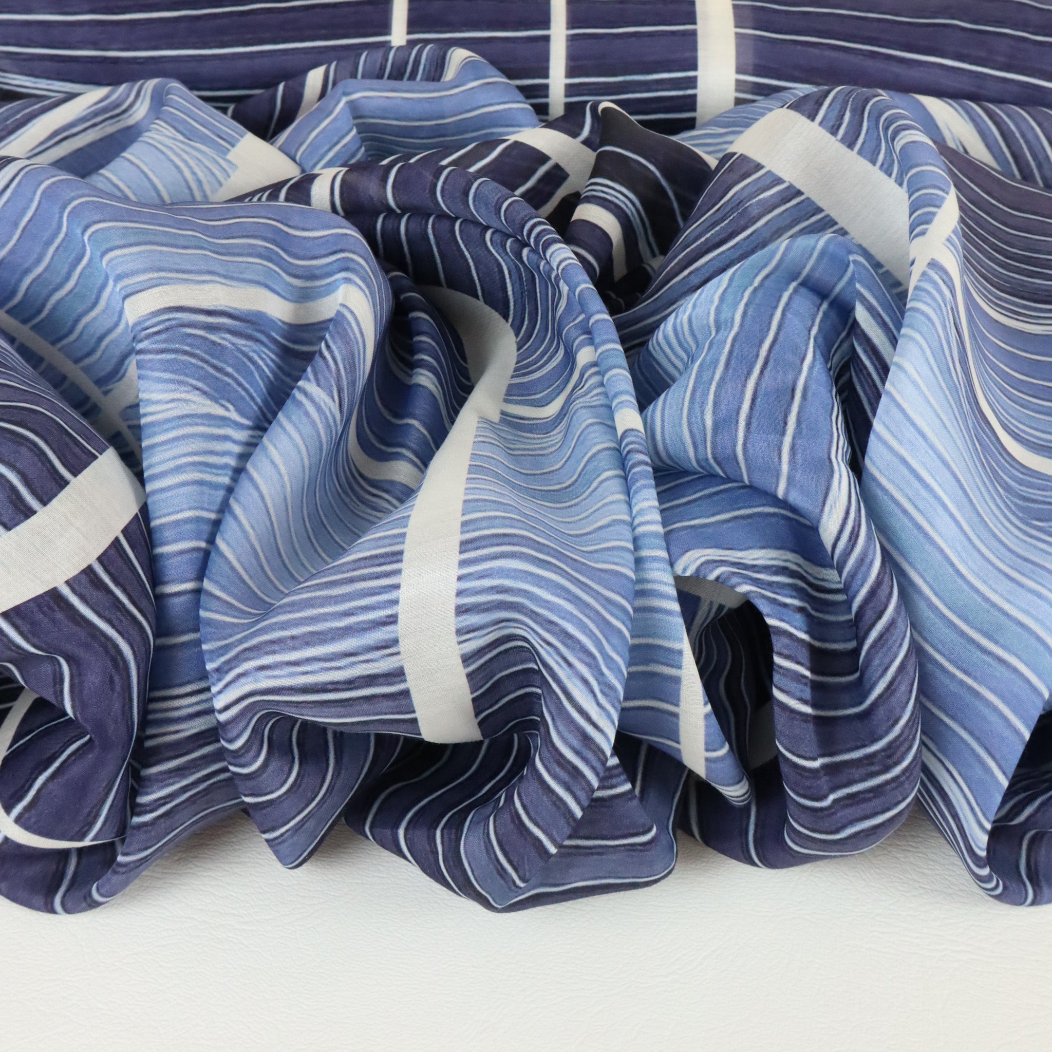 Lightweight Silk Cotton Georgette Print Deadstock in Ocean Flow. These cotton/silk deadstock fabrics are lightweight and fluid, woven in a plain weave with a semi-opaque finish.