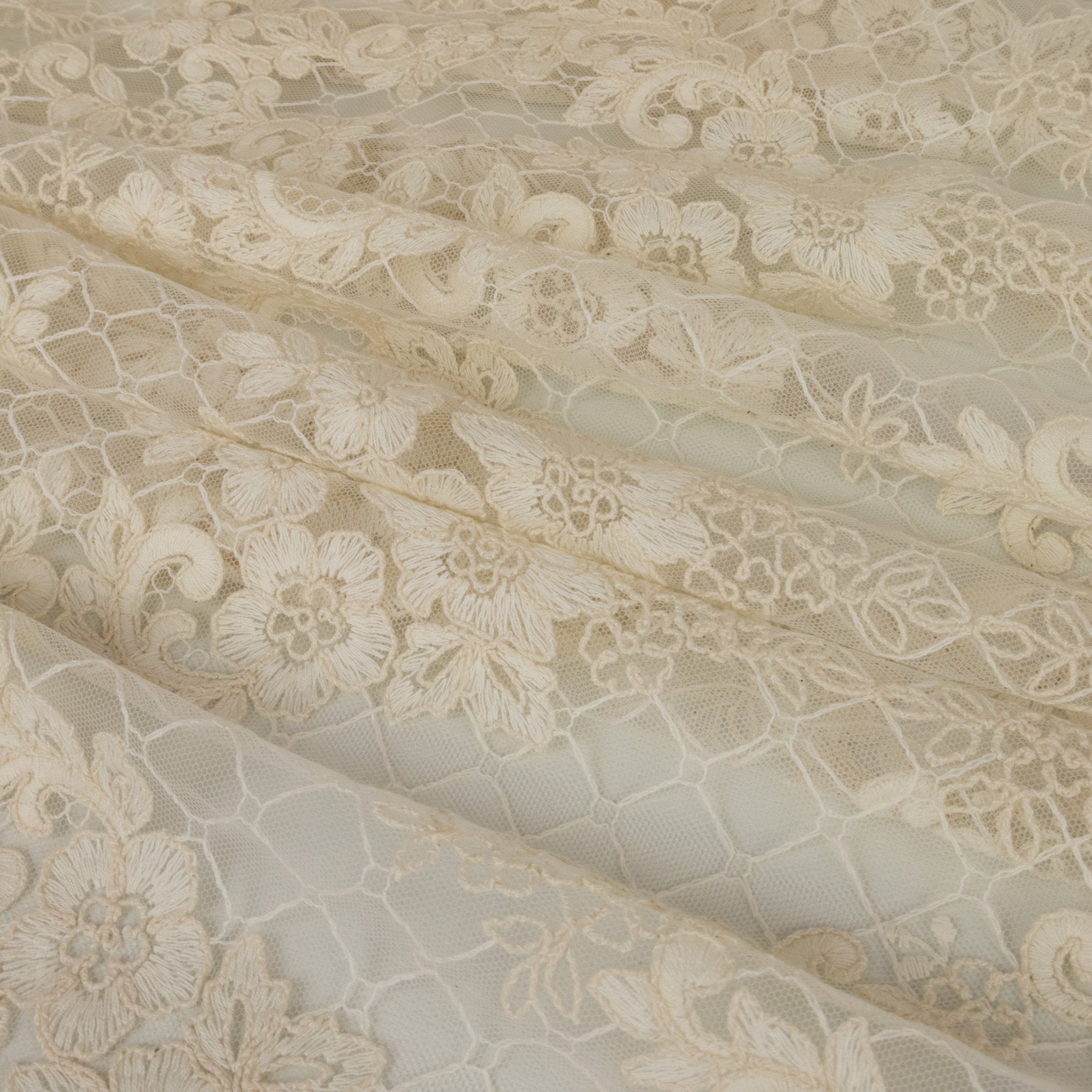 Lula Embroidered Lace Designer End – Vintage Cream. A vintage-style lace in soft cream, embroidered on a sheer mesh base with a romantic floral design. Finished with a scalloped edge, this fabric is perfect for dresses, blouses, overlays, and bridal-inspired pieces. Sourced as a true designer end, available in limited quantities.
