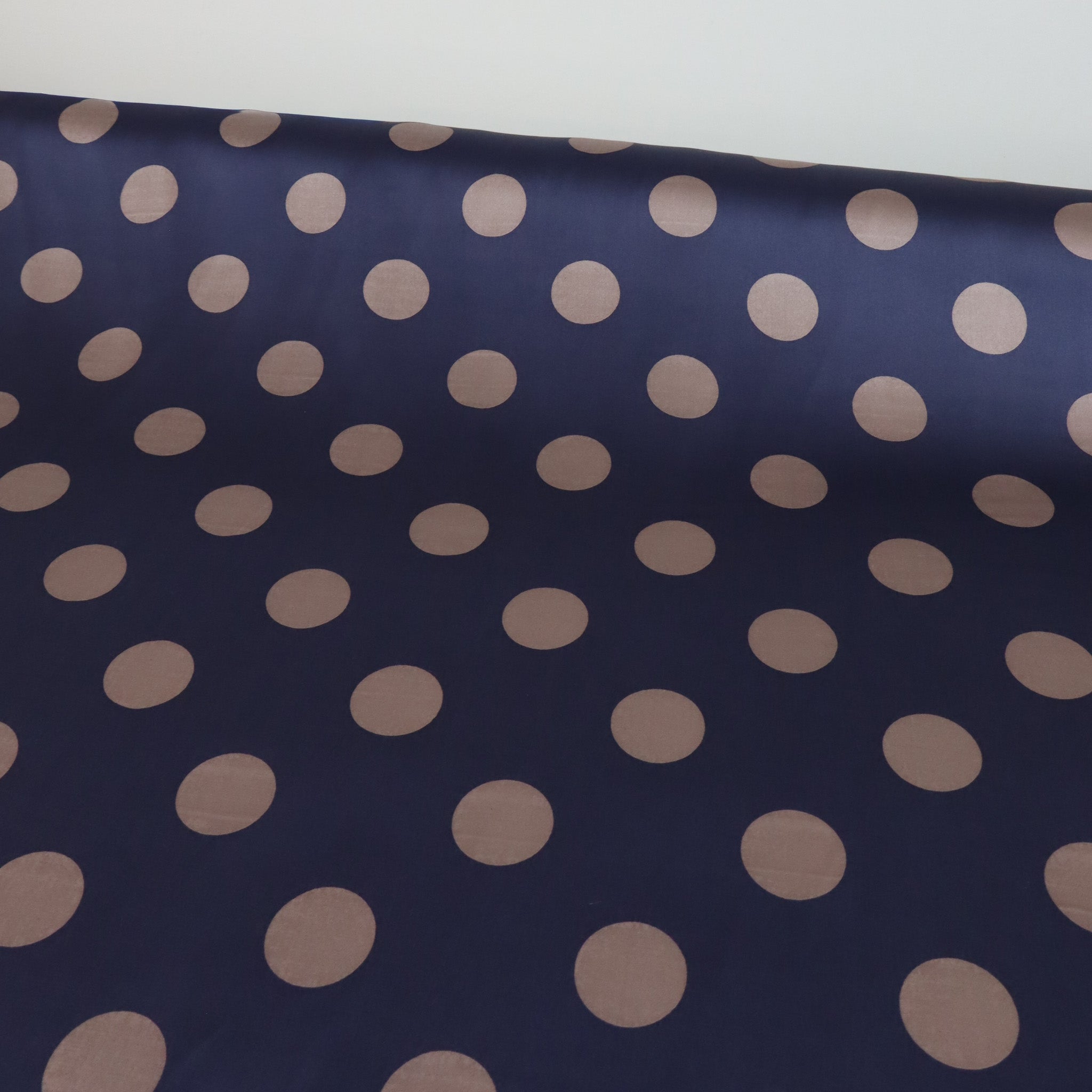 Spot Printed Satin Deadstock - Iris. A playful spot-printed satin in iris blue/purple, part of our limited deadstock range. With a smooth finish and fluid drape, it’s perfect for tops, dresses, or even as a fun lining.