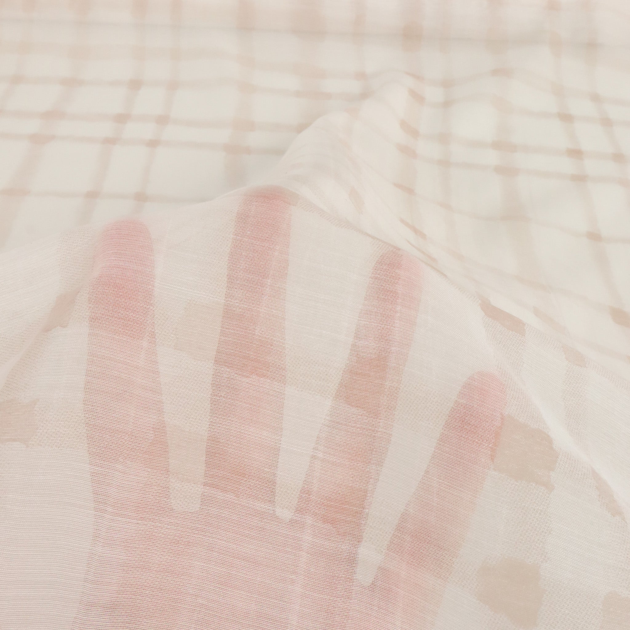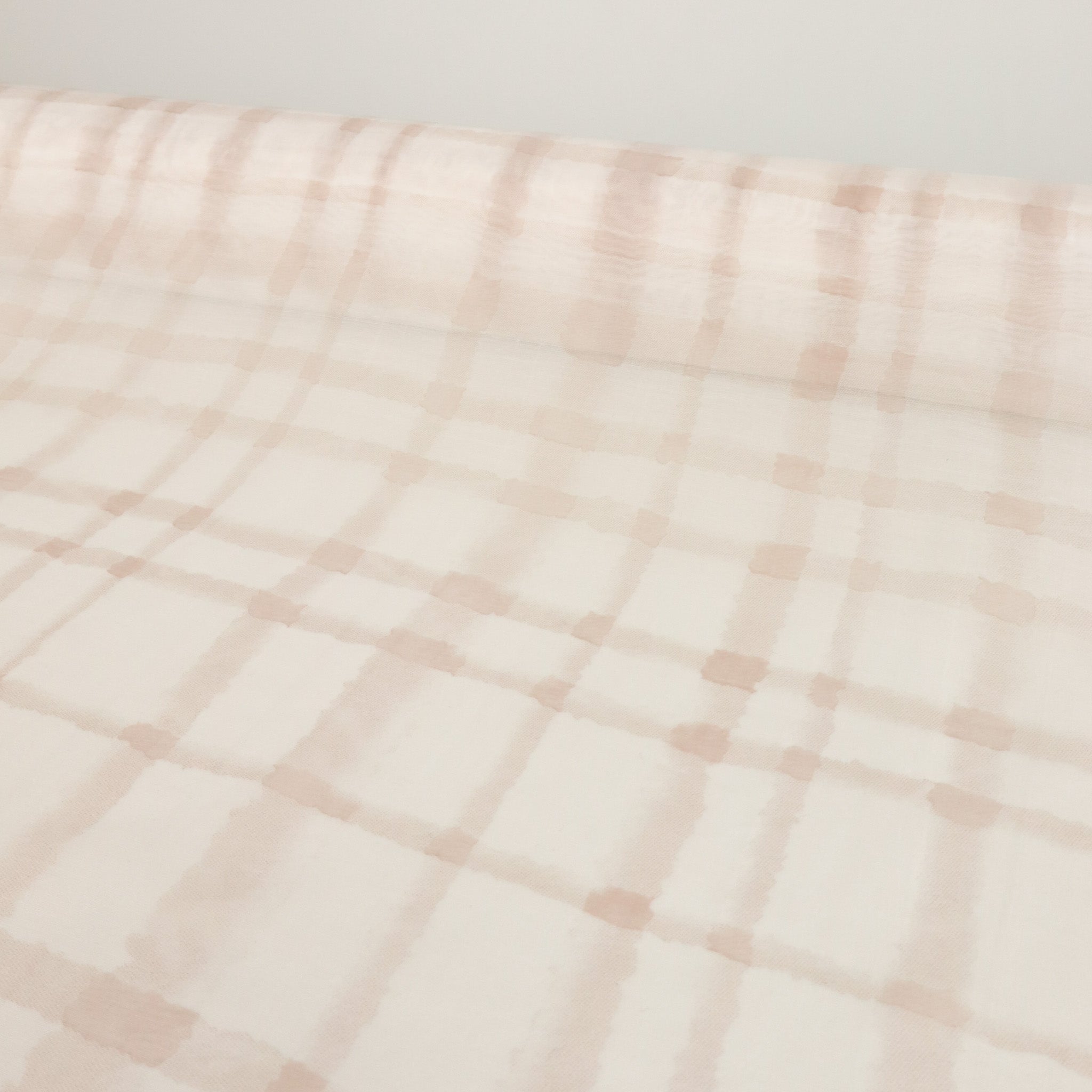 Tencel Nylon Abstract Check Print - Thistle Pink. A lightweight Tencel-nylon with a voile-like base, featuring an abstract check print. Smooth and airy with gentle drape, this fabric is ideal for blouses, dresses, and layering pieces. Due to the nylon content, a low iron is recommended if needed.